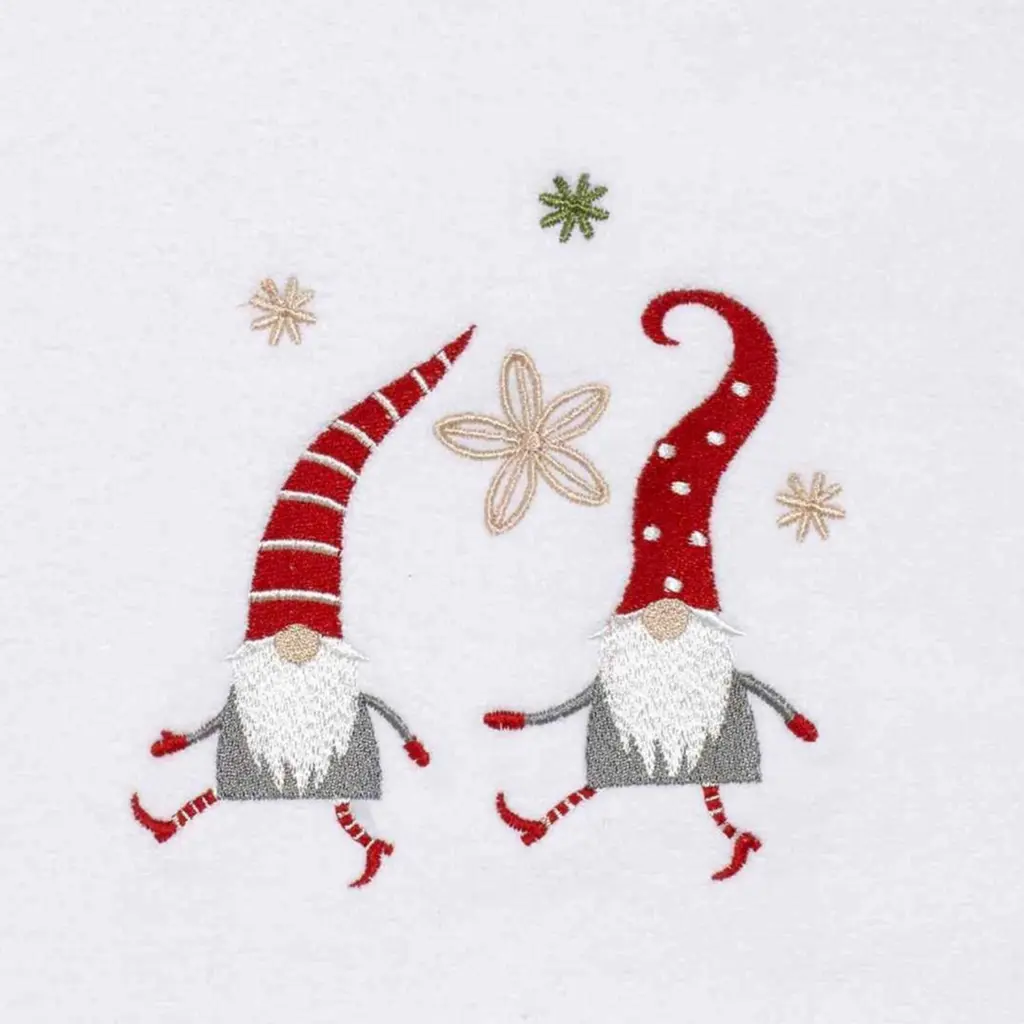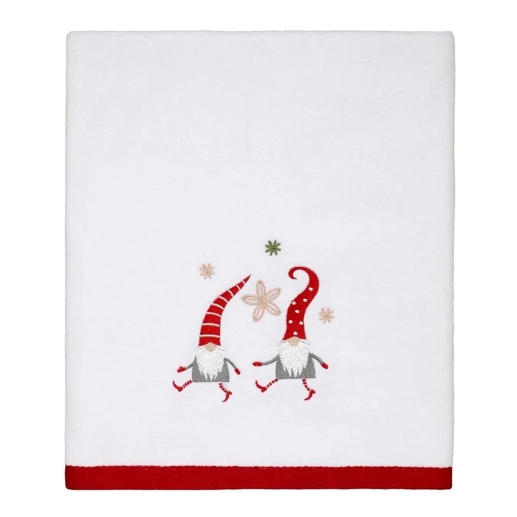 The Avanti Gnome Walk Decorative Bath Towel is embroidered with 2 adorable gnomes with a big, whimsical red hats and long white beards. The 27" x 50" 100% cotton white towel has a contrasting red polyester border. Coordinating shower curtain, towels, rug and accessories available.