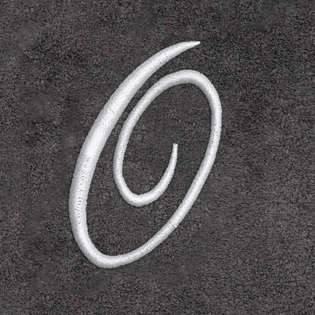 The Premier Granite/Silver Script Monogram Bath Towel features an embroidered silver script "O" on a dark grey ground. The 27" x 52" ringspun cotton terry granite towel is plush and absorbent and feels as great as it looks. Matching hand and fingertip sizes and other letters also available.