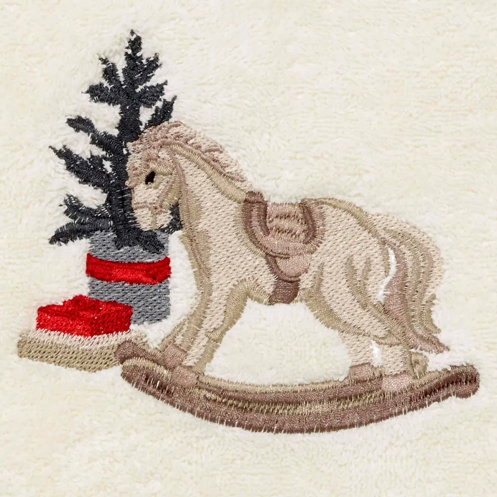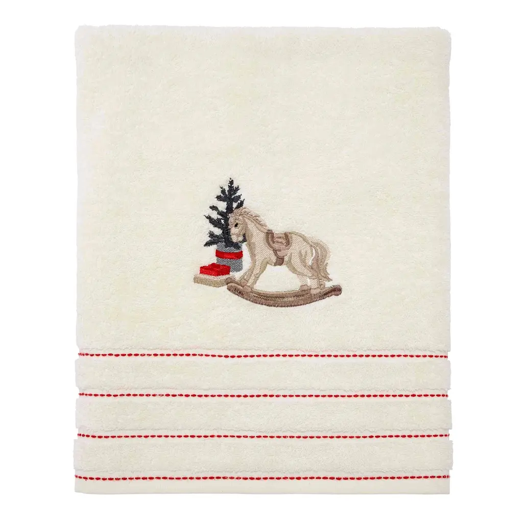 The Avanti Holiday Countdown Bath Towel features an embroidered rocking horse with presents and a Christmas tree, finished with a coordinating woven stitch-like red polyester border . The towel is 27" x 52" 100% cotton (exclusive of ornamentation) ivory terry. Other coordinating pieces available.