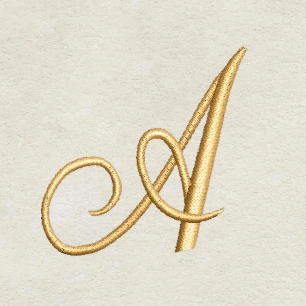 The Premier Ivory with Gold Script Monogram Bath Towel features an embroidered metallic gold script "A" on an ivory ground. The 27" x 52" ringspun cotton terry ivory towel is plush and absorbent and feels as great as it looks. Matching hand and fingertip sizes and other letters also available.