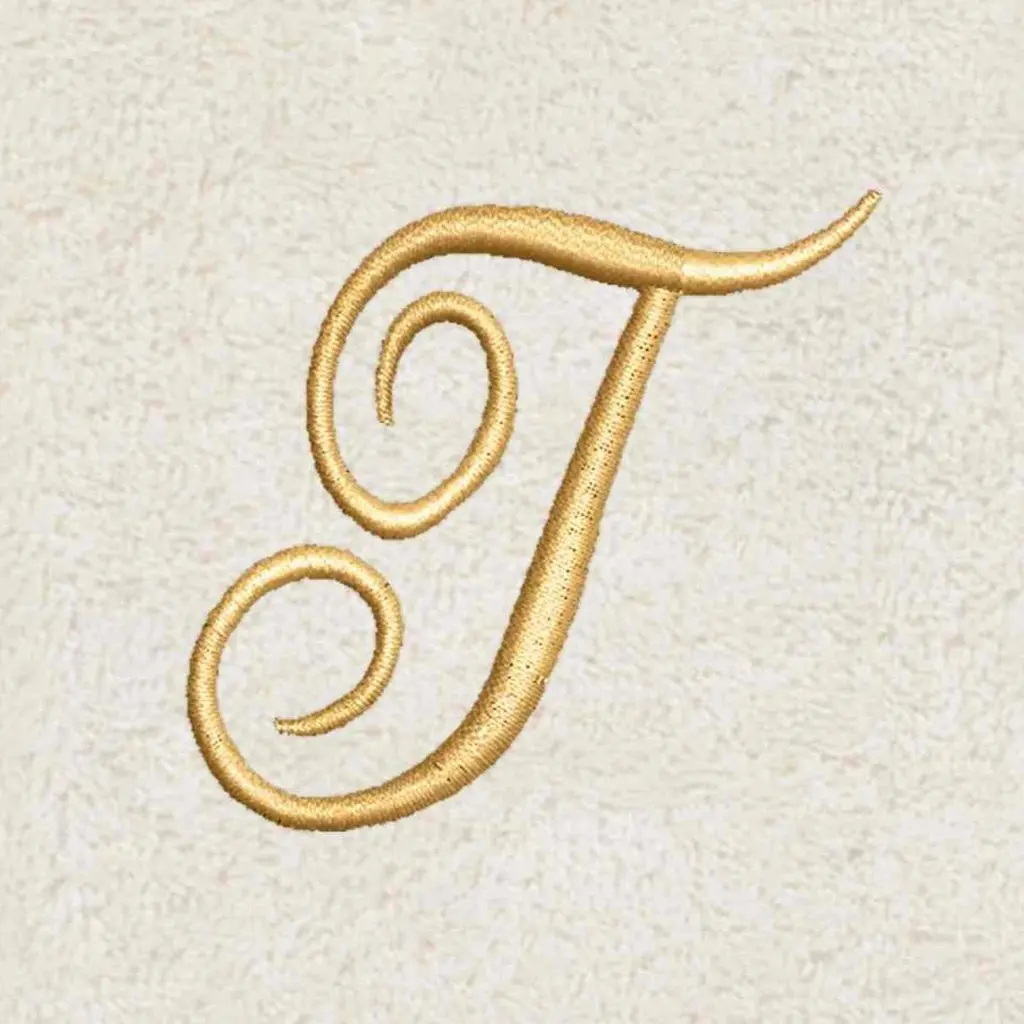 The Premier Ivory with Gold Script Monogram Bath Towel features an embroidered metallic gold script "T" on an ivory ground. The 27" x 52" ringspun cotton terry ivory towel is plush and absorbent and feels as great as it looks. Matching hand and fingertip sizes and other letters also available.