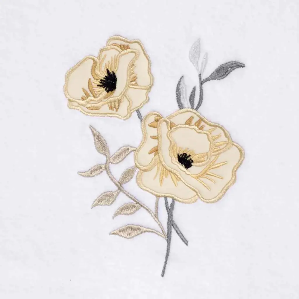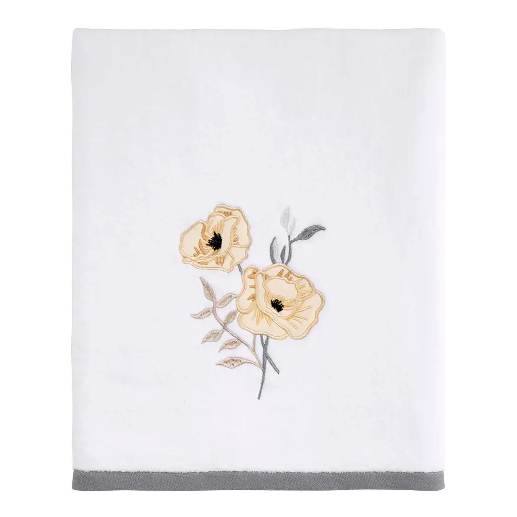 The Avanti Marielle Decorative Bath Towel features 2 large embroidered yellow flowers with grey stems and vines on a white ground. The coordinating woven grey dobby border adds the perfect finishing touch. 27" x 52", 100% cotton (exclusive of embellishment) velour towel.