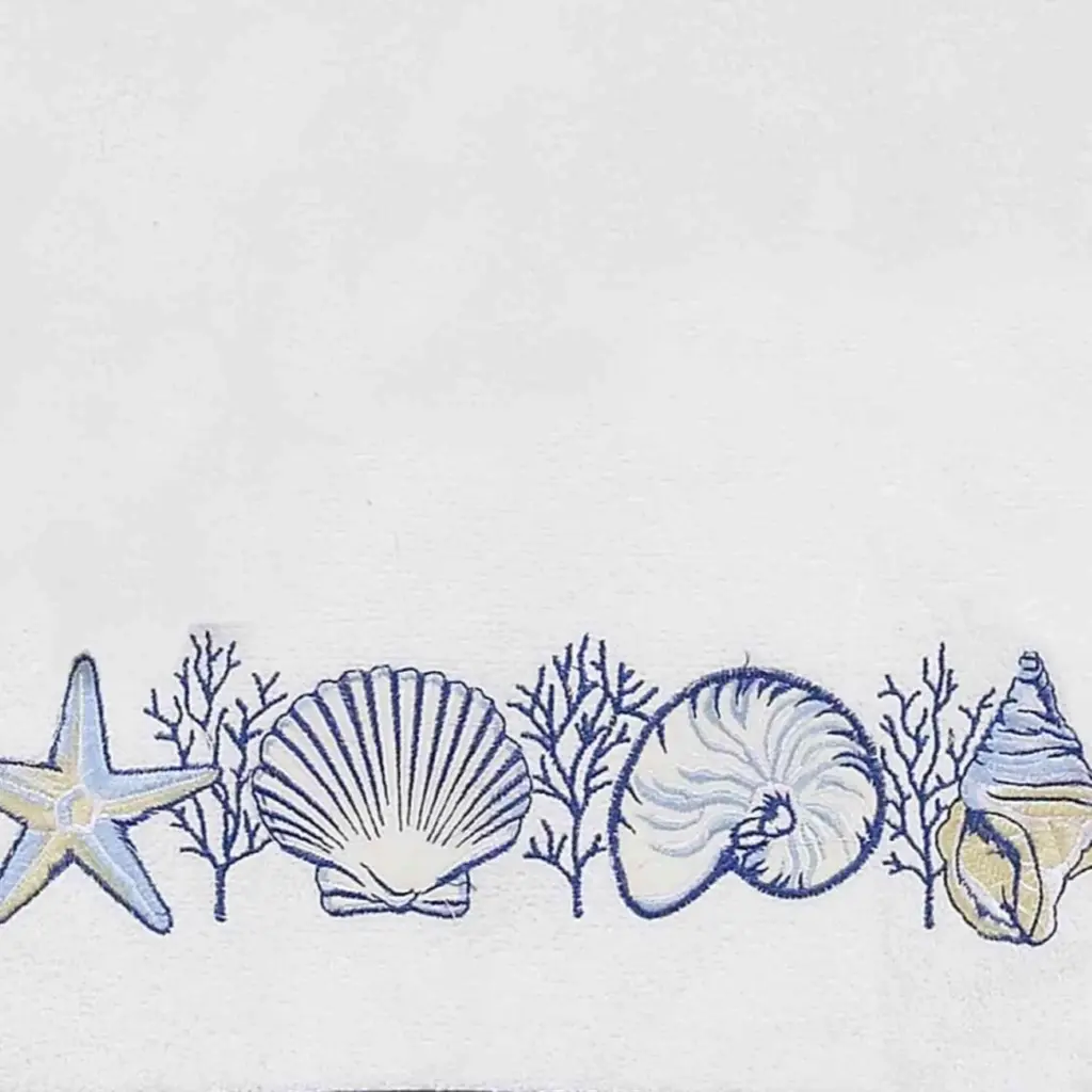 The Avanti Nassau White Decorative Embellished Bath Towel is an embroidered fan shell, starfish and coral design in shades of blue and beige with a two-tone light blue and navy fabric border. 27" x 50" 100% cotton white velour towel. Hand and fingertip sizes also available.