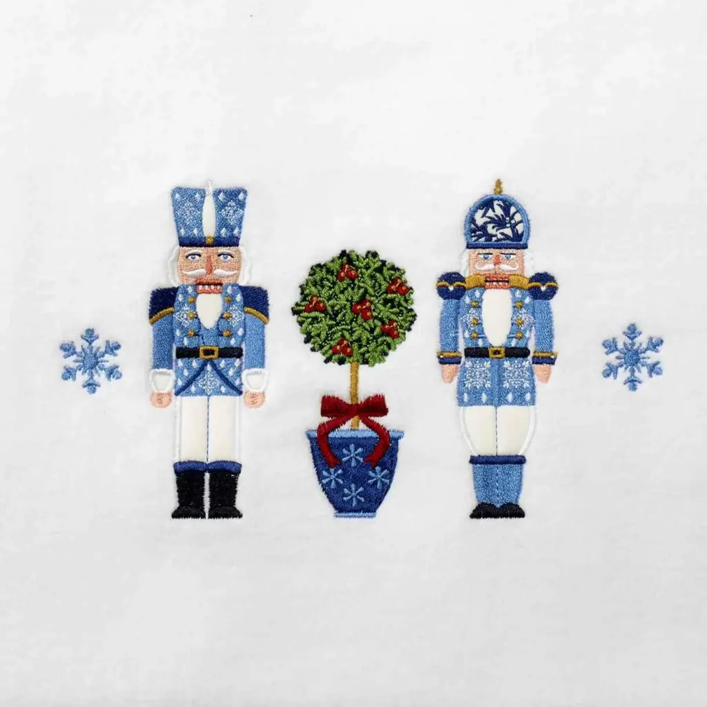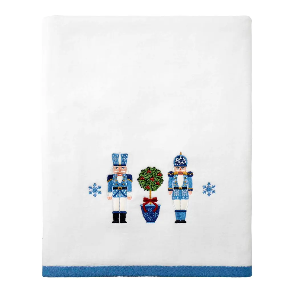 The Avanti Nutcracker Trellis Bath Towel features 2 embroidered nutcrackers outfitted in various shades of blue flanking a Christmas topiary set off on a white ground. The 27" x 50" 100% cotton velour towel is finished with a coordinating blue polyester border. Other coordinating pieces available.
