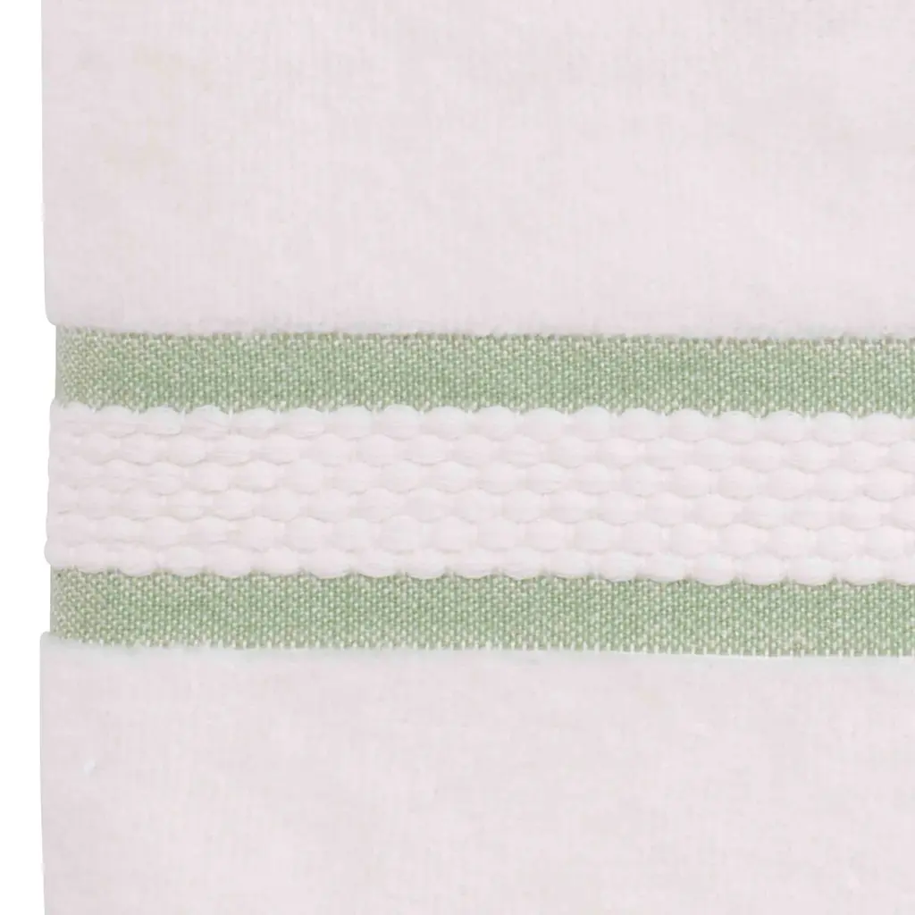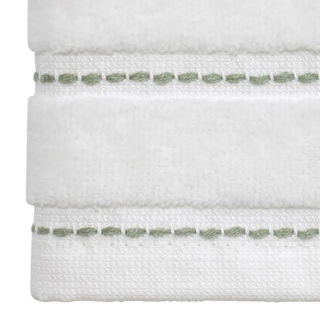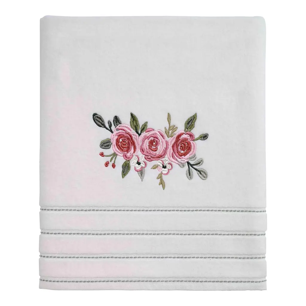 The Avanti Spring Garden Bath Towel is decorated with 3 embroidered peonies in shades of pink with green leaves and woven, yarn-dyed green border stripes on an ivory ground. Made of soft and absorbent 100% ring spun cotton, 27" x 52". Other coordinating pieces also available.