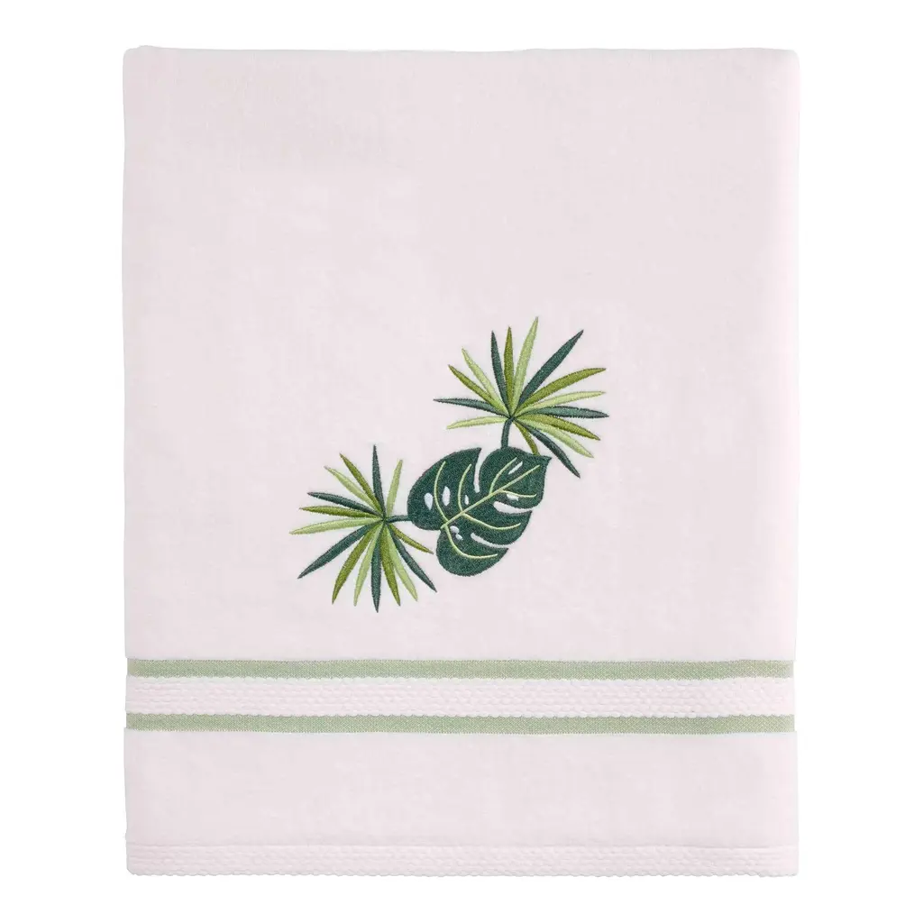 The Avanti Viva Palm Decorative Bath Towel features a beautifully embroidered petticoat palm and split leaf philodendron design in shades of green on a white terry ground. Towel is 100% cotton, exclusive of embellishment, with coordinating green polyester stripes to finish the look. 27" x 52".