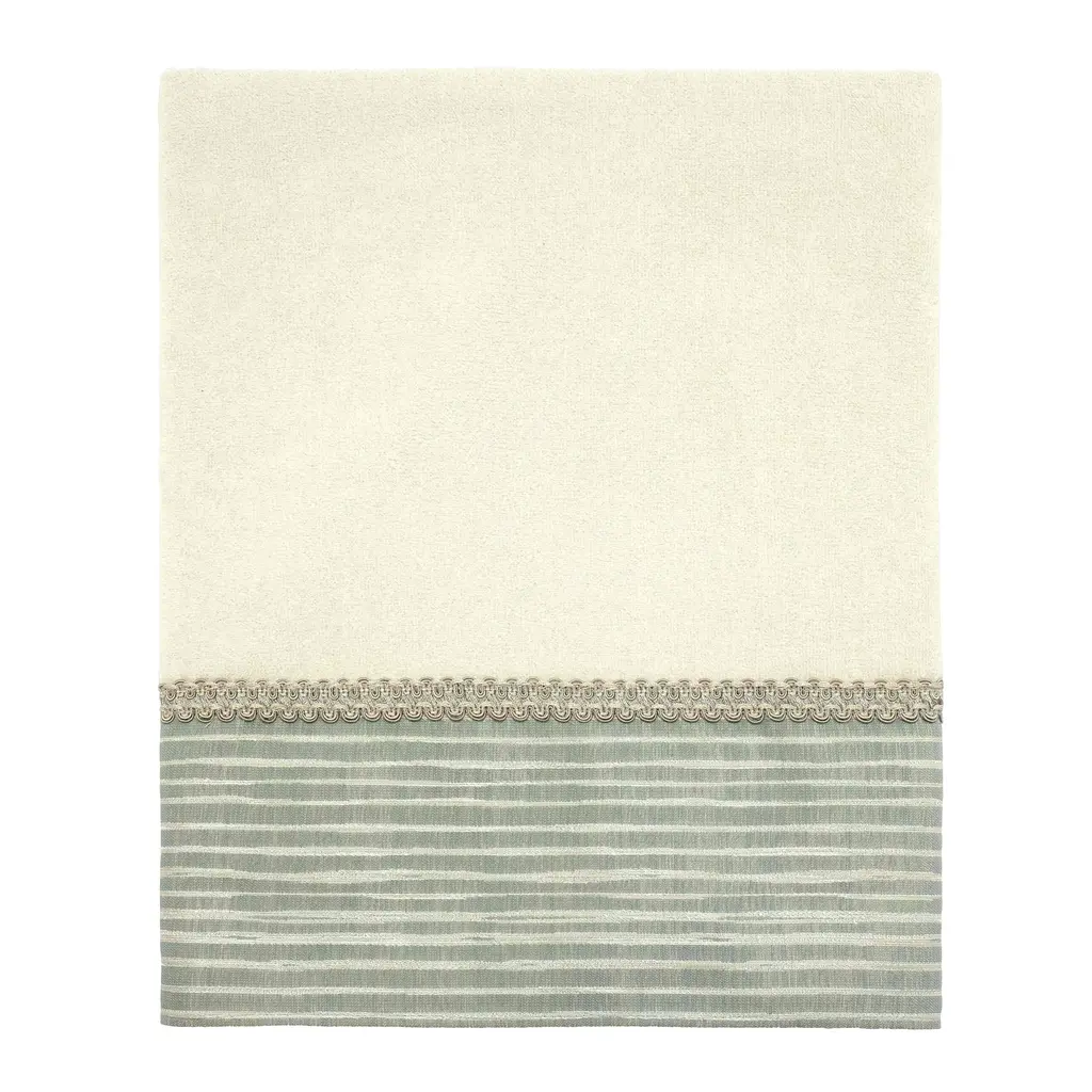 The Avanti Weston Ivory Bath Towel features a sage woven fabric border with horizontal irregular shimmering ivory stripes. A coordinating sage and ivory flat braid is attached at the top hem. The 27" x 50", 100% cotton ivory towel is sheared for a silky, smooth finish.