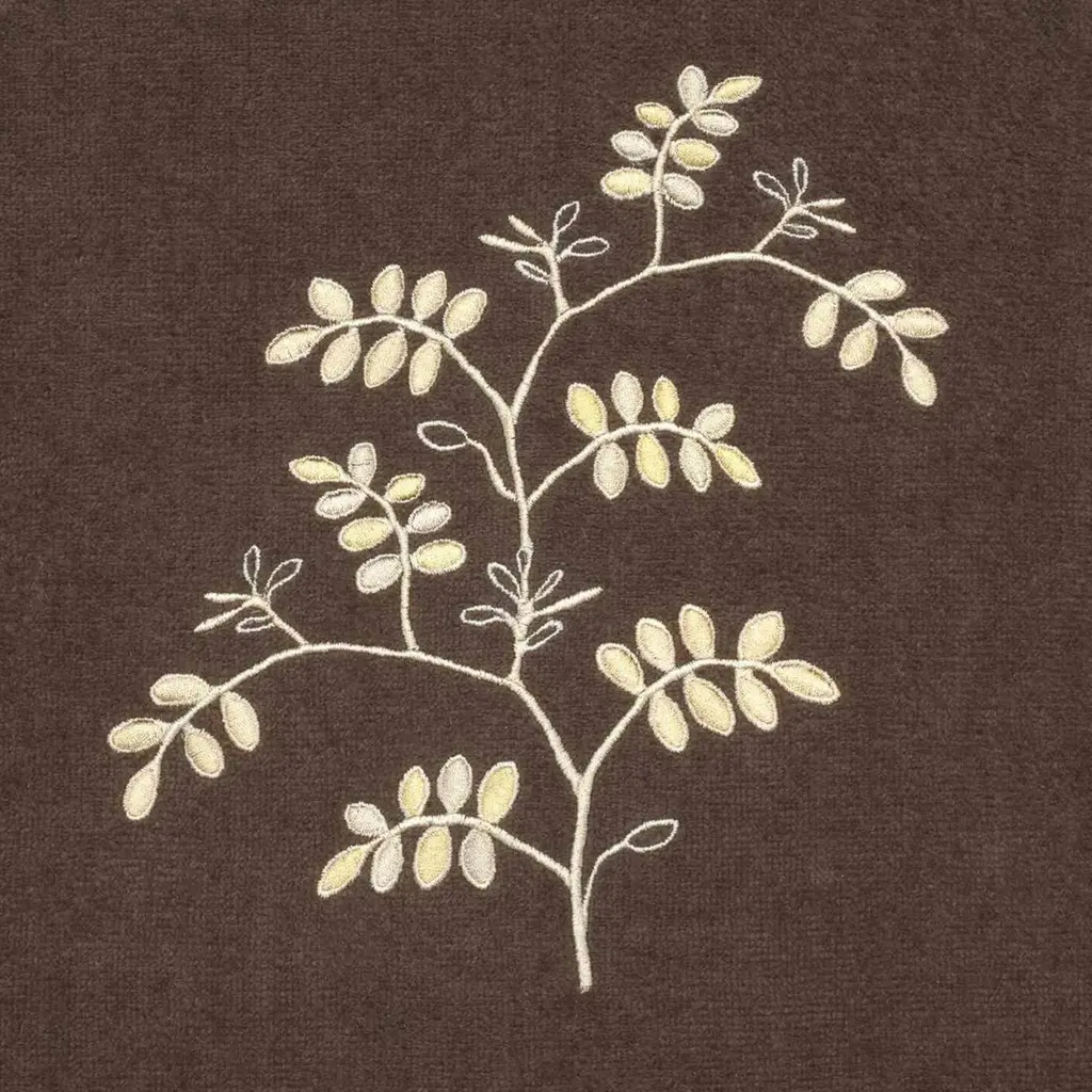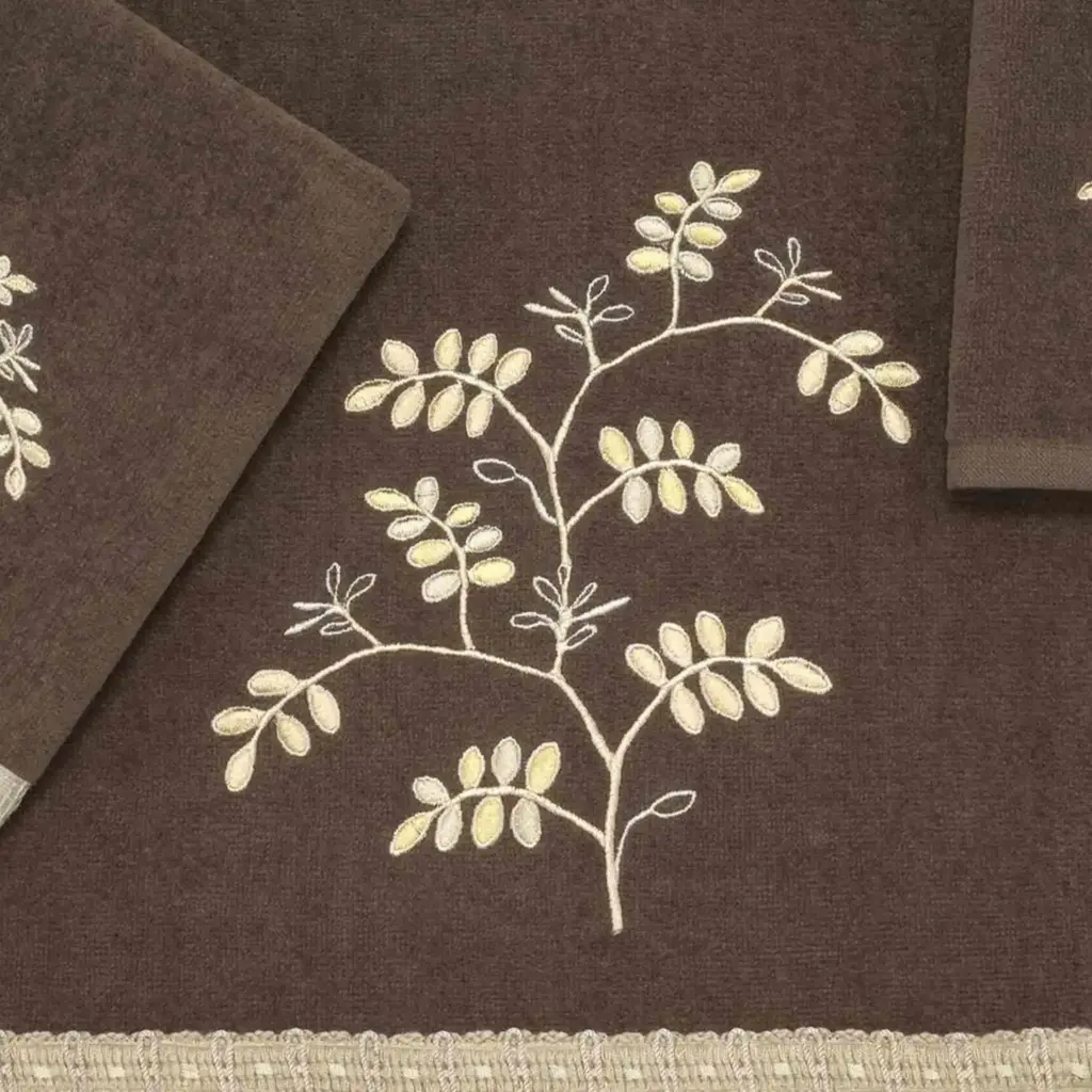 The Avanti Willow Mocha Bath Towel features embroidered gold and taupe branches and leaves on a medium brown ground. The towel is finished with a gold and grey shimmering textured trim with braid and ball fringe. The 27" x 50" 100% cotton mocha towel is sheared for a silky, smooth finish.
