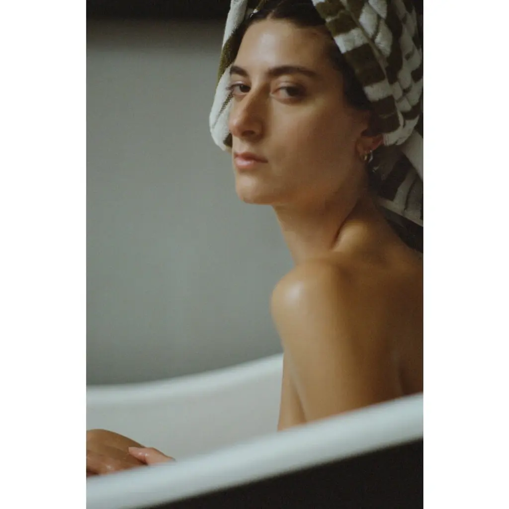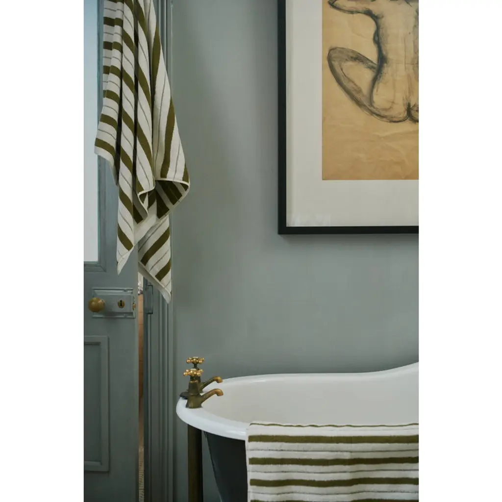 The Baina Franklin bath towel features a fresh two-tone stripe pattern with alternating thick woven stripes and small checkerboard embroideries. The design is mirrored on the reverse side in opposite shades. This terry bath towel is made from plush, thick organic cotton, achieving the perfect balance between absorbency, softness and quick drying time. Baina's bathroom textiles are designed to bring luxury to everyday life, transforming daily bathing into a calm and enjoyable ritual. Their patterns draw inspiration from many directions, such as fine arts, architecture and color theory. Baina textiles are crafted from organic cotton at a weaving mill in Portugal.