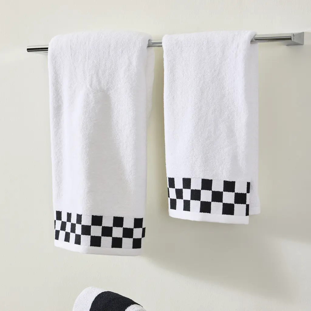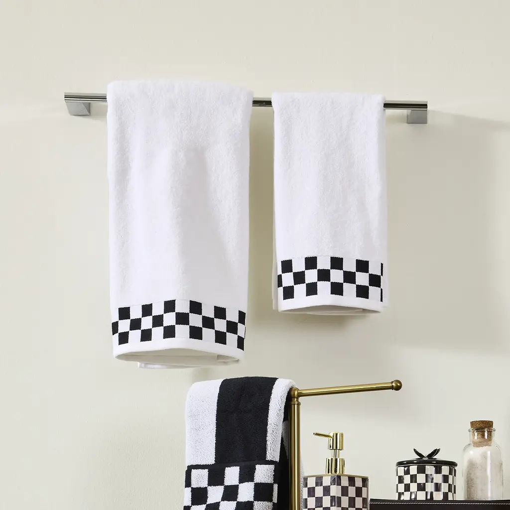 Make a splash with the plush feel and elegant checks of this Bath Towel with Black Check Border. Made of soft cotton terrycloth and trimmed with contrasting black and white checks. Give your bath an instant makeover and turn scrubbing up into something spectacular.