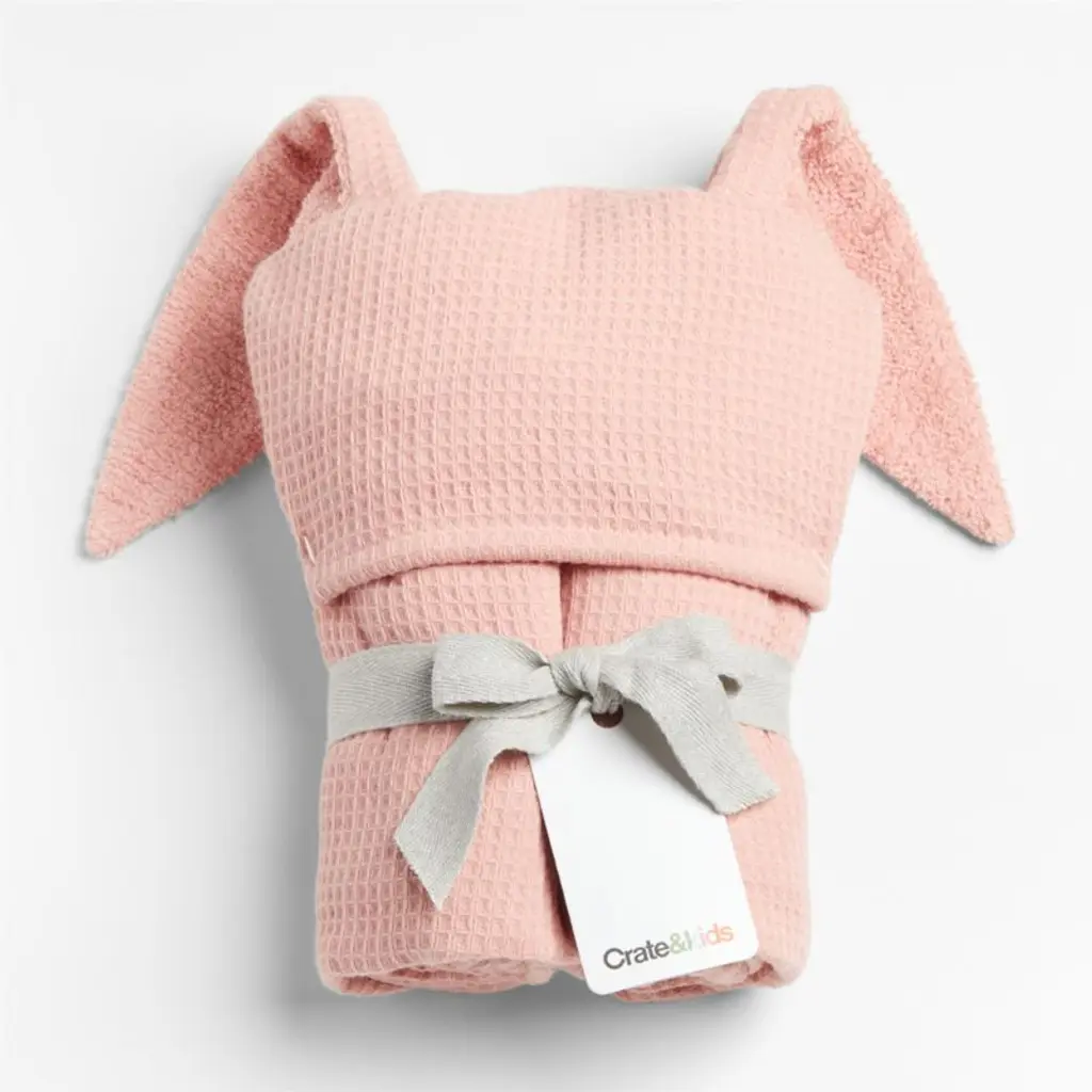 End every bath with a warm, fuzzy bear hug. Our pink hooded kids towel is tailored of soft and absorbent organic cotton that is especially gentle on sensitive skin. A waffle weave texture makes the towel plush yet lightweight and fast drying. Detailed with two long, floppy ears, the hooded kids towel can be paired with our Bunny wash mitt for a fun bathtime duo (and a thoughtful gift).
