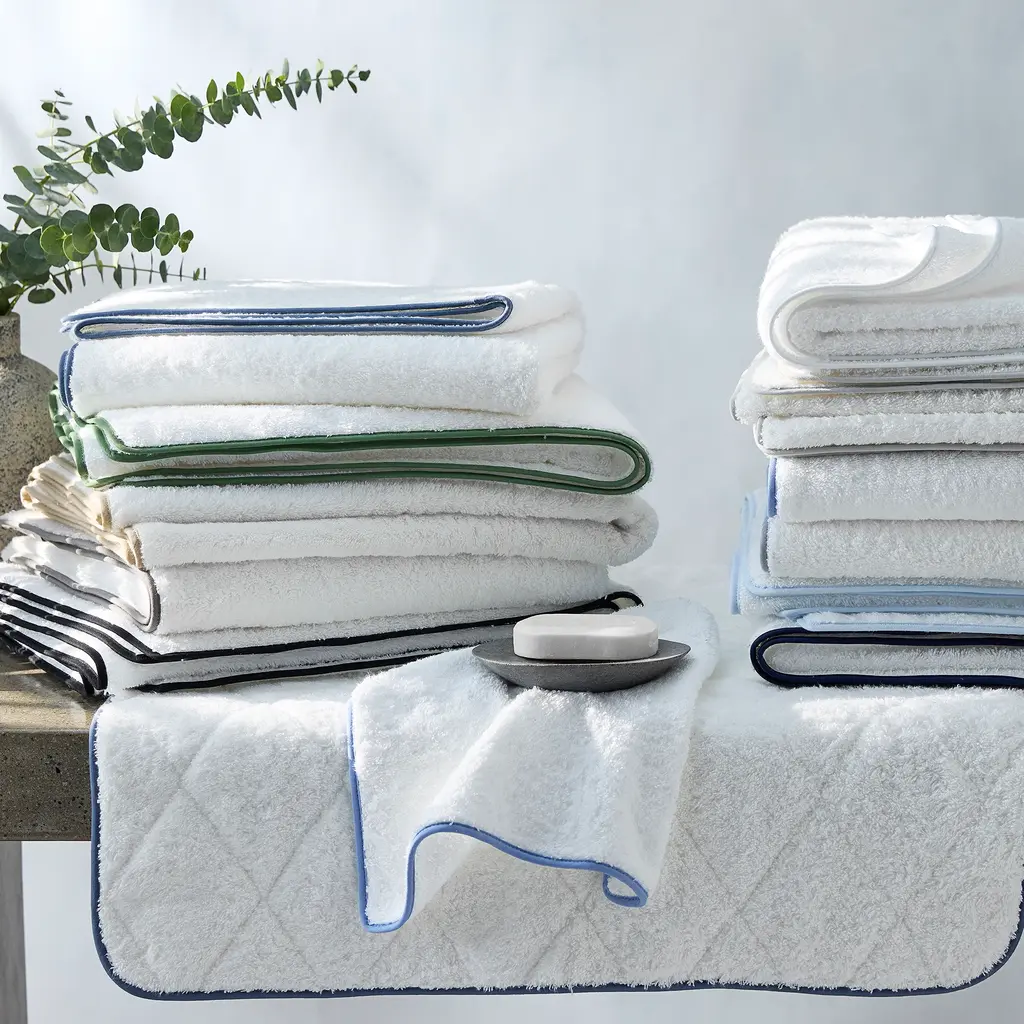 Soft, plush and absorbent cotton terry with a contrasting color piped trim.