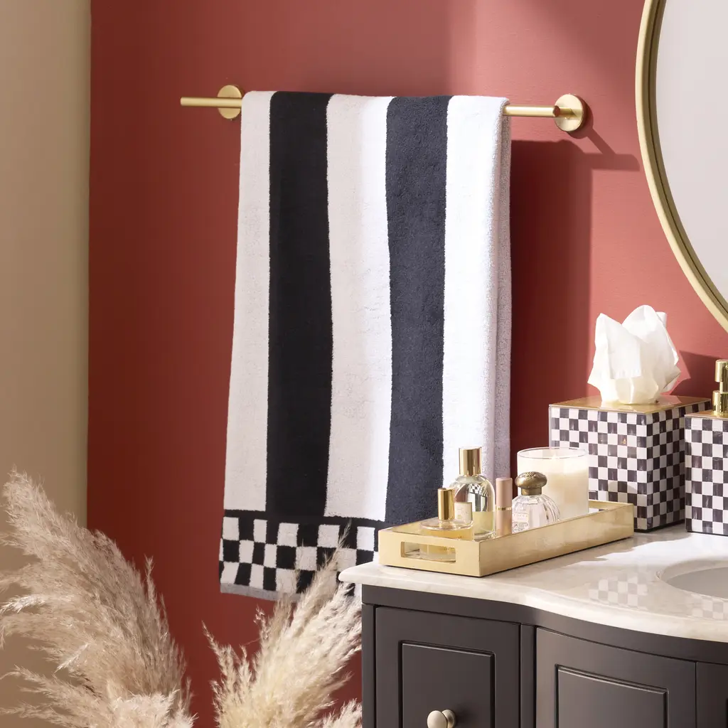 Make a splash with the plush feel and contrasting tones of our Courtly Stripe Bath Towel. Made of soft cotton terrycloth, it features bold Courtly Stripe and is trimmed with complementary miniature black and white checks. Give your bath an instant makeover and turn scrubbing up into something spectacular.