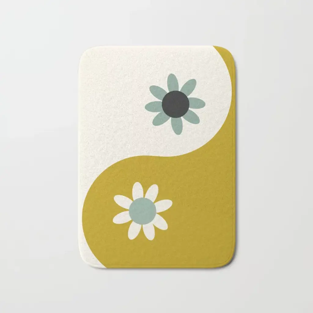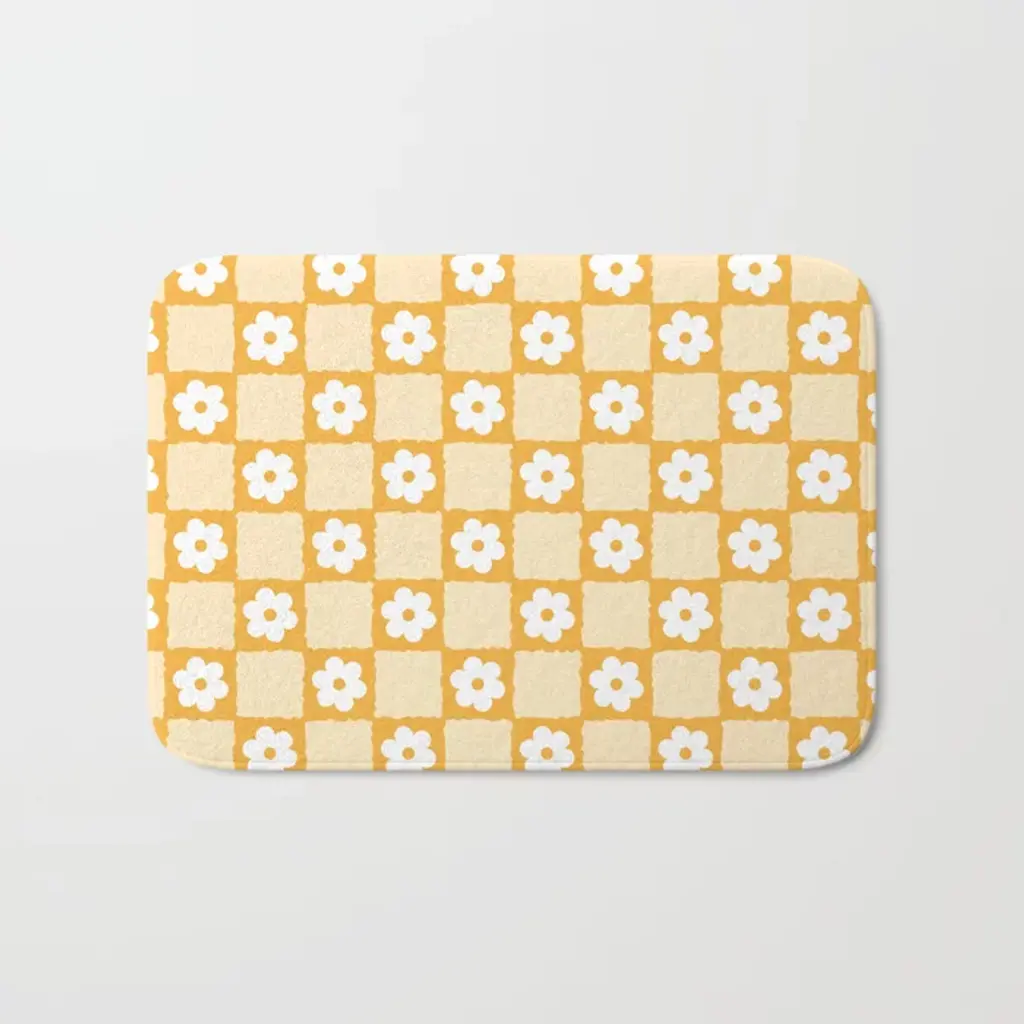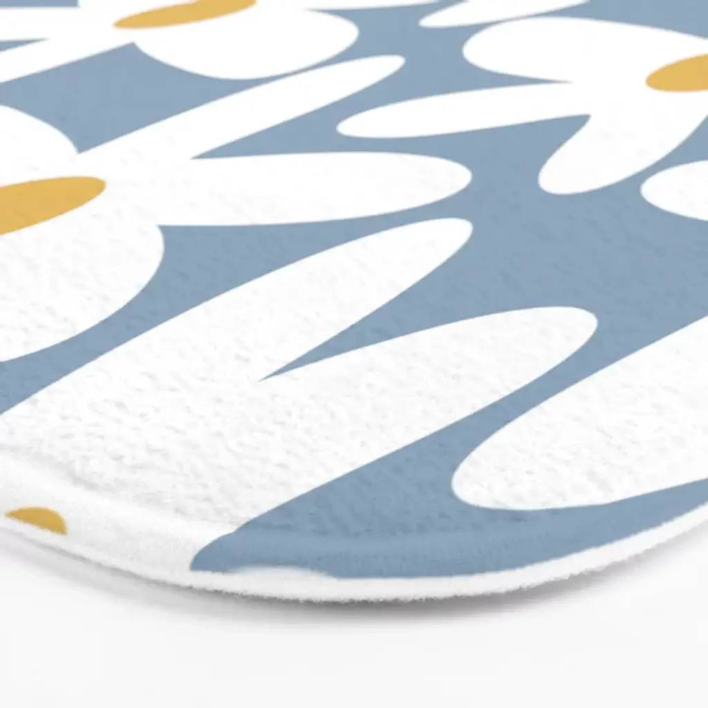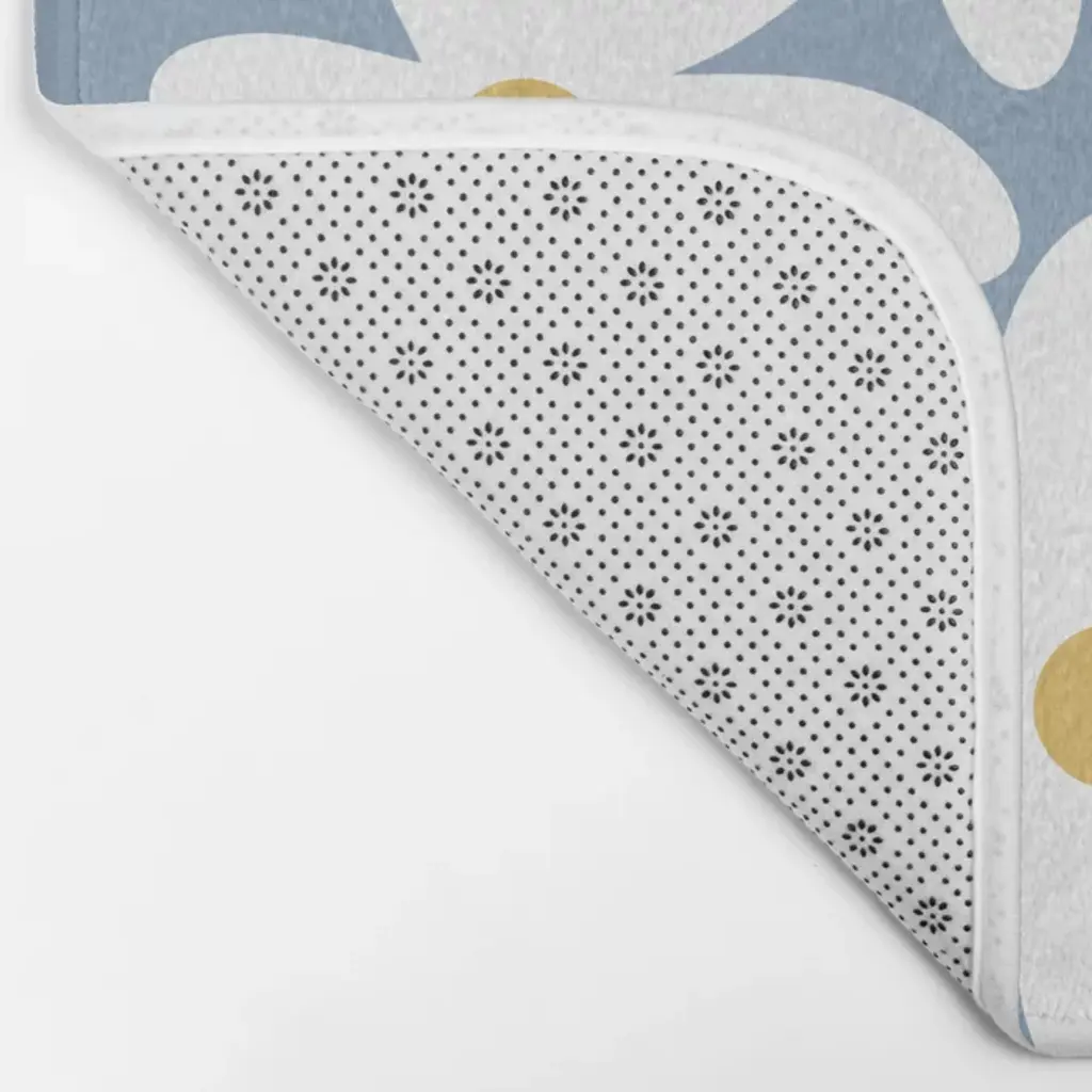Daisy Time Retro Floral Pattern In Light Blue, White, And Mustard Bath Mat