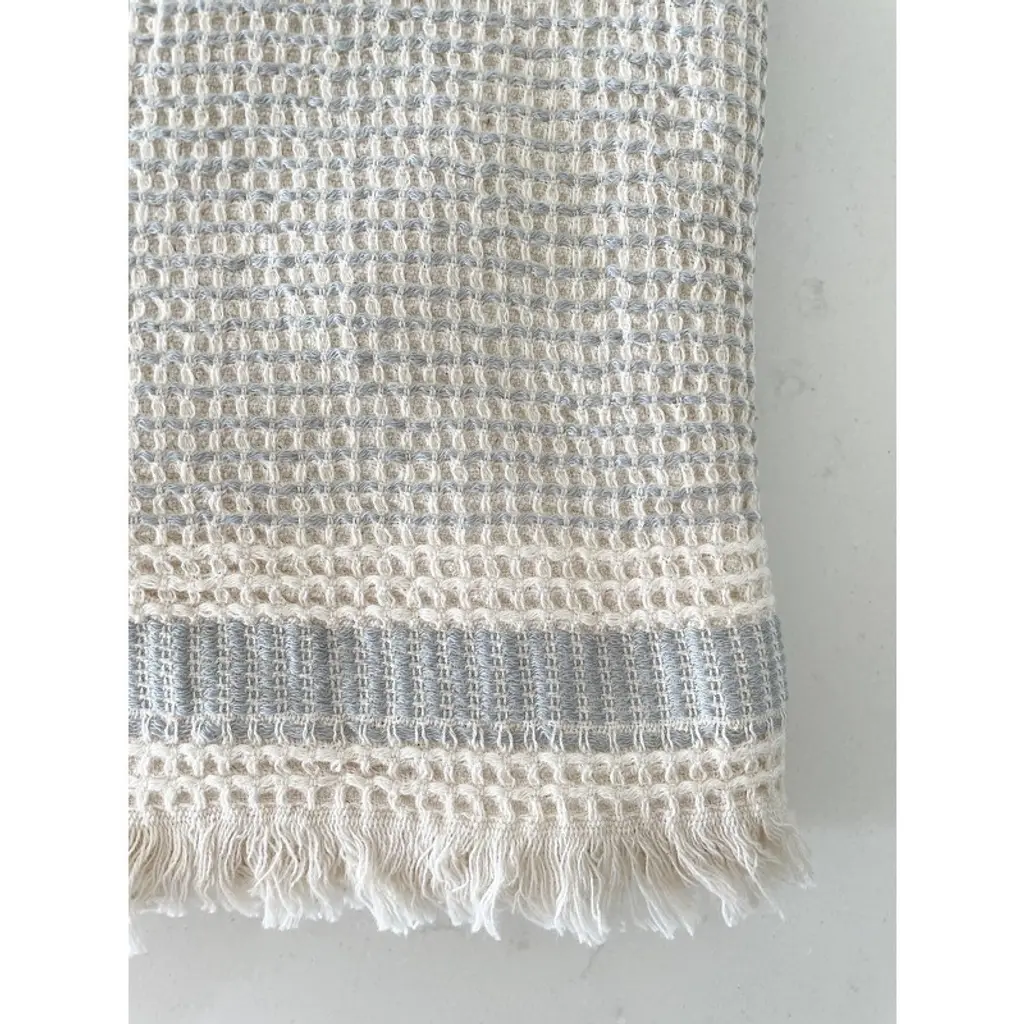 The Mini Waffle with Striped Edge Cotton Bath Towel is made with soft breathable naturally wicking cotton and finished with a bold stripe and self fringe. This towel is versatile and displays in any modern bathroom or it can be used as a chic pool or beach towel. Two colored yarns are woven together to create this unique mini waffle pattern. Machine Wash.