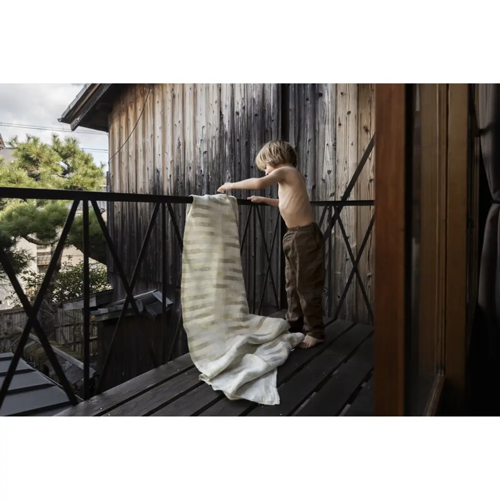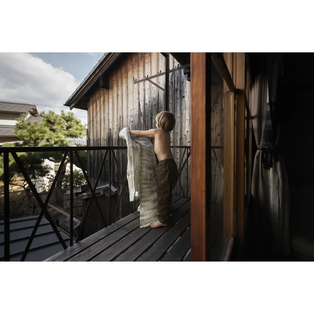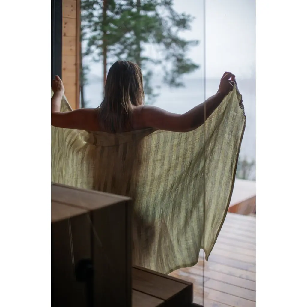 The Hohto bath towel by Lapuan Kankurit is the perfect match for a summer day. Wrap yourself in the towel after a swim or use it as a picnic blanket on the beach or in the park. The giant towel also brightens up the look of the bathroom with a beautiful Hohto pattern, designed by Elisa Defossez Kikuchi. The designer found inspiration for the pattern in the sun's beams shimmering through the leaves of trees – a phenomenon known in Japan as "komorebi". The Hohto towel is made in Finland of washed European linen, a carefree material with a naturally laid-back appearance. It is not necessary to iron the towel – small wrinkles and creases only give it a charming relaxed, natural look.