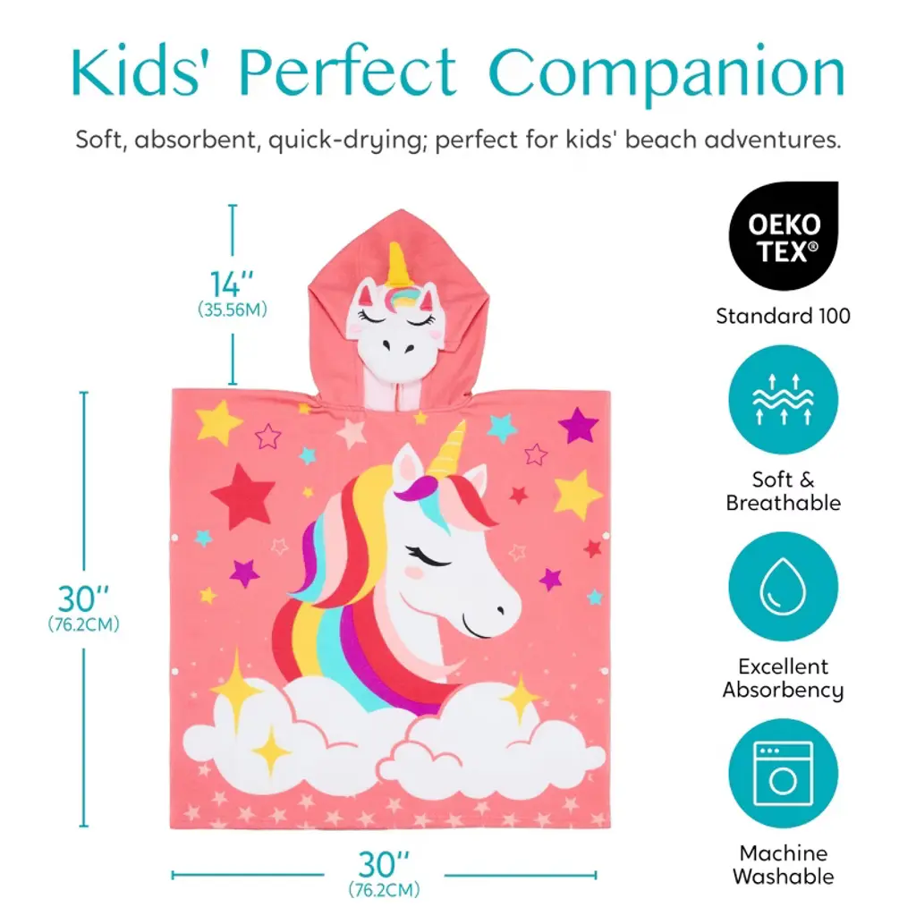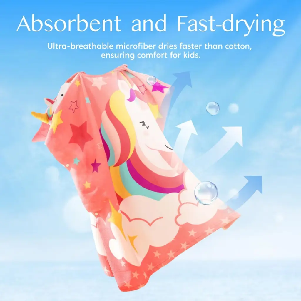 This ultra-soft, 100% breathable microfiber hooded towel by Joyfy is perfect for children aged 3-10, offering exceptional softness, water absorption, and durability, making it ideal for delicate and sensitive skin. Measuring 30 x 44 inches with a 10 x 14-inch hood, it provides ample coverage and warmth, while the quick-drying material and secure hood design ensure comfort and convenience. The towel is versatile, suitable for use at home, the beach, or the pool, and comes with a portable shoulder bag for easy carrying. Its machine-washable fabric stays smooth and soft after each wash. Available in vibrant, creative designs like unicorns, mermaids, and dinosaurs, it makes bath time, swimming, and beach trips more enjoyable, serving as a thoughtful and practical gift for kids.