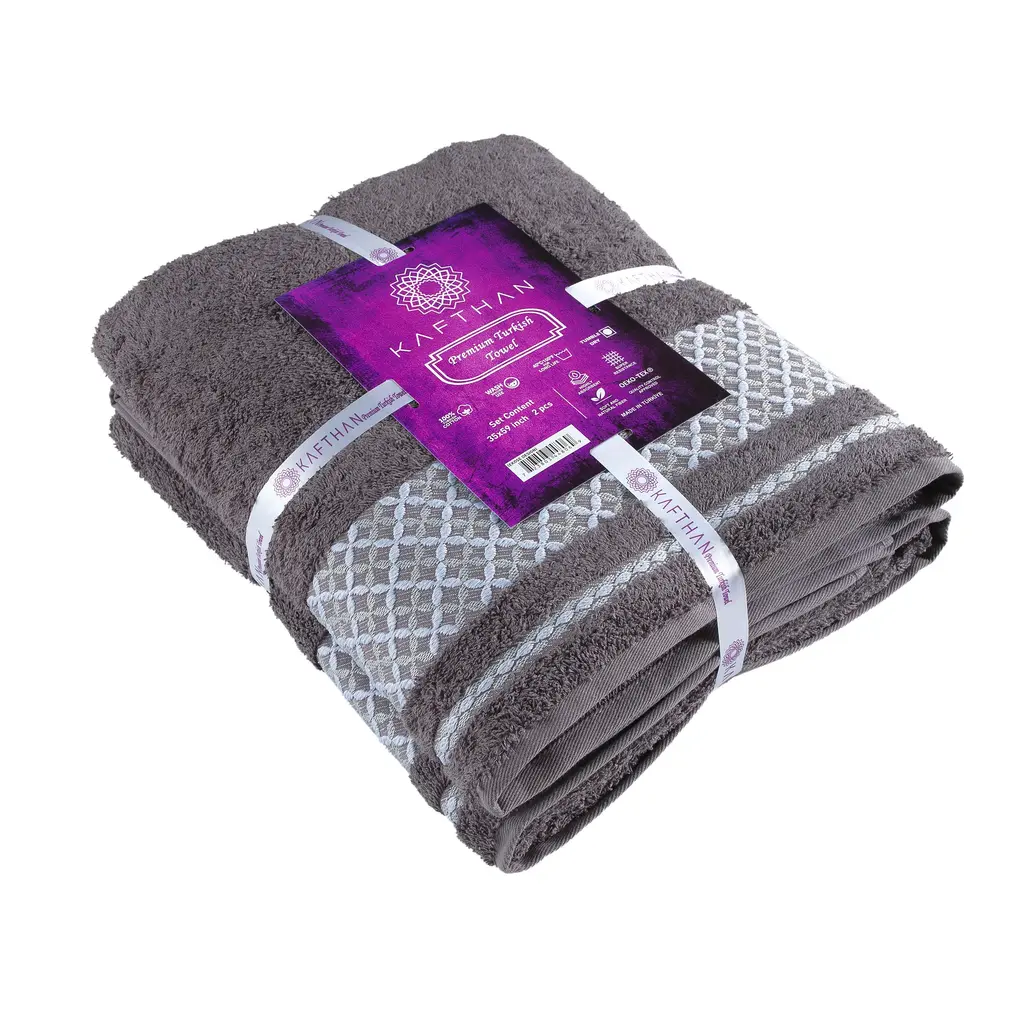 Graphically gorgeous, KAFTHAN's bath towel set feature sophisticated Byzantium and Ottoman motifs in various colors. They are made in Turkey with premium 100% Turkish cotton for luxurious softness and exceptional absorbency.. The set is composed of 2 XL bath towels / sheets (35"x59"). KAFTHAN's 600 GSM towels are manufactured in an OEKO-TEX Standard 100 factory, an independent certification system that ensures textiles meet high safety and environmental standard. Care: Machine washable and tumble dry.Features: