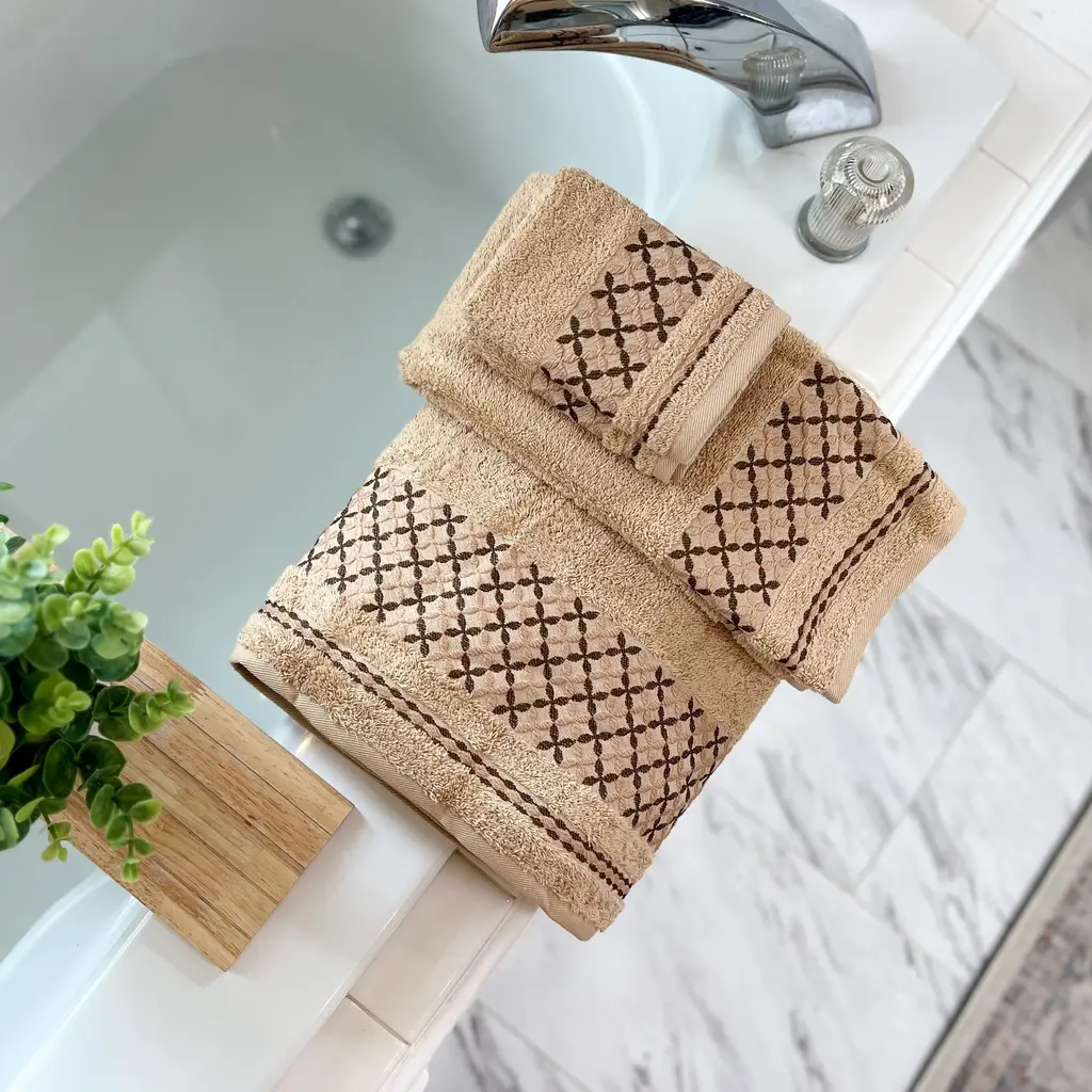 Graphically gorgeous, KAFTHAN's bath towel set feature sophisticated Byzantium and Ottoman motifs in various colors. They are made in Turkey with premium 100% Turkish cotton for luxurious softness and exceptional absorbency. The set is composed of 1 XL bath towel/sheet (35"x59") + 1 face/hand/hair towel (18"x 30") 2 washcloths (13"x13"). KAFTHAN's 600 GSM towels are manufactured in an OEKO-TEX Standard 100 factory, an independent certification system that ensures textiles meet high safety and environmental standard. Care: Machine washable and tumble dry.Features: