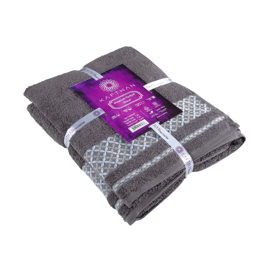 Graphically gorgeous, KAFTHAN's bath towel set feature sophisticated Byzantium and Ottoman motifs in various colors. They are made in Turkey with premium 100% Turkish cotton for luxurious softness and exceptional absorbency. The set is composed of 1 XL bath towel/sheet (35"x59") + 1 face/hand/hair towel (18"x 30") 2 washcloths (13"x13"). KAFTHAN's 600 GSM towels are manufactured in an OEKO-TEX Standard 100 factory, an independent certification system that ensures textiles meet high safety and environmental standard. Care: Machine washable and tumble dry.Features: