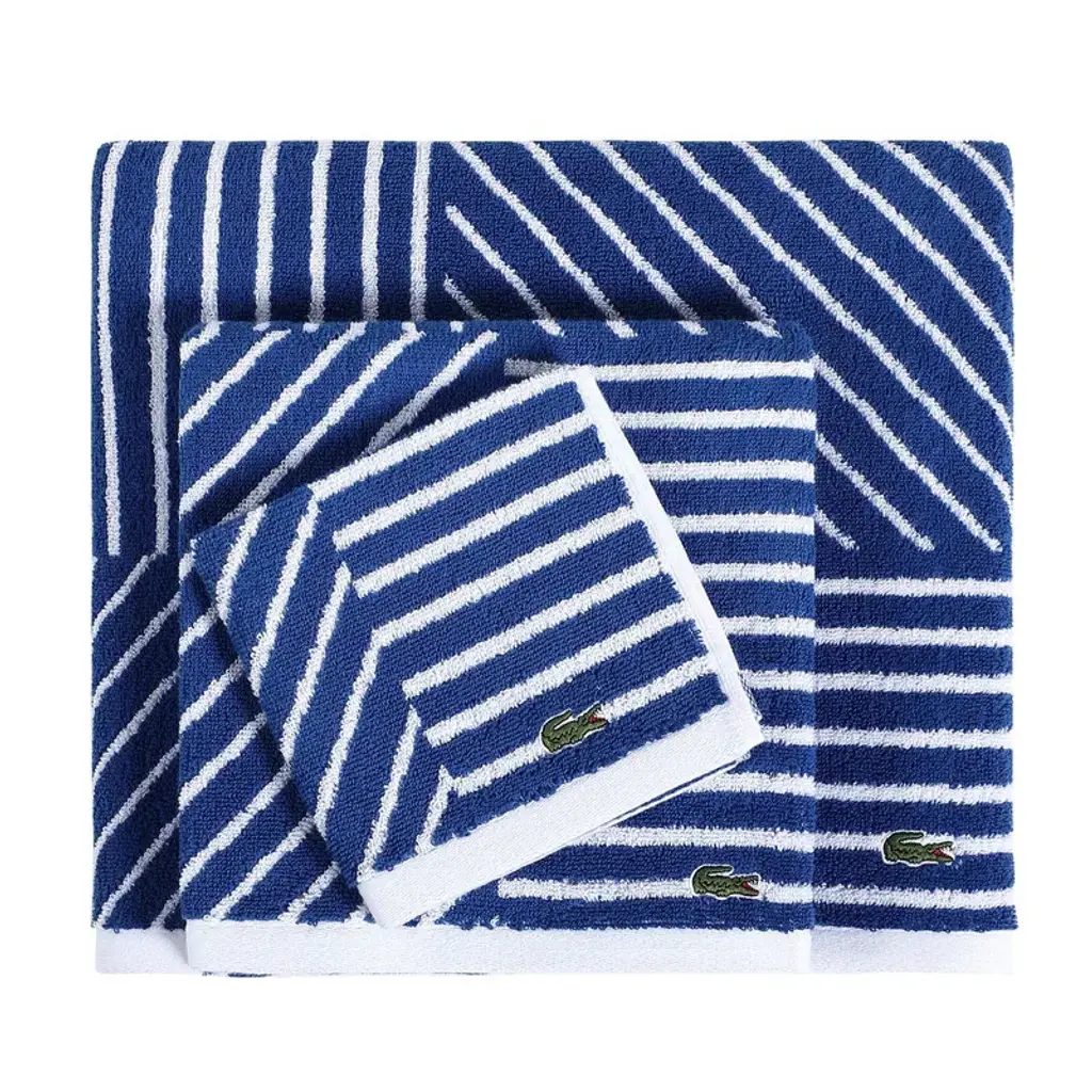 Add fresh color and modern graphic appeal to your bathroom with these cotton Guethary towels from Lacoste. The playful pattern of these soft and absorbent yarn-dyed towels reverses to an inverted color scheme on each side, adding effortless style to the bathroom. This highly absorbent and low linting towel is made of 100% cotton. Features the classic iconic croc logo on every towel. This designer towel is the perfect size to dry off after bathing, and is easy to maintain as it is machine washable in cold water with like colors on gentle cycle. Features: