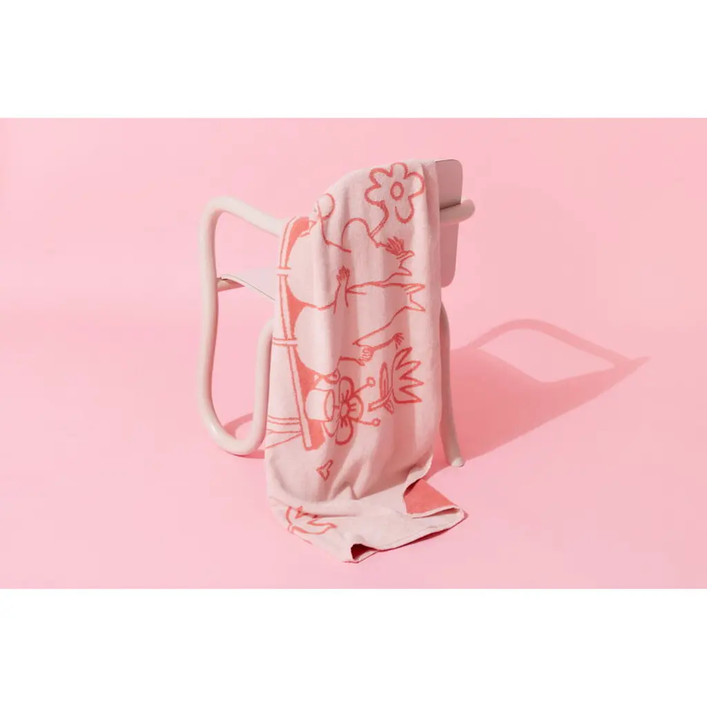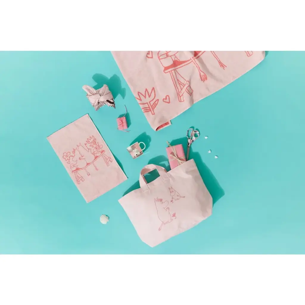 The Love towel by Moomin Arabia brings the enchanting atmosphere of Moominvalley to every day! Made of organic cotton, the towel is adorned with an adorable illustration where Snorkmaiden and Moomintroll paint flowers on the walls of their house. The illustration is based on the comic Moomin Builds a House, in which Moomintroll decides to build a house for himself and Snorkmaiden.