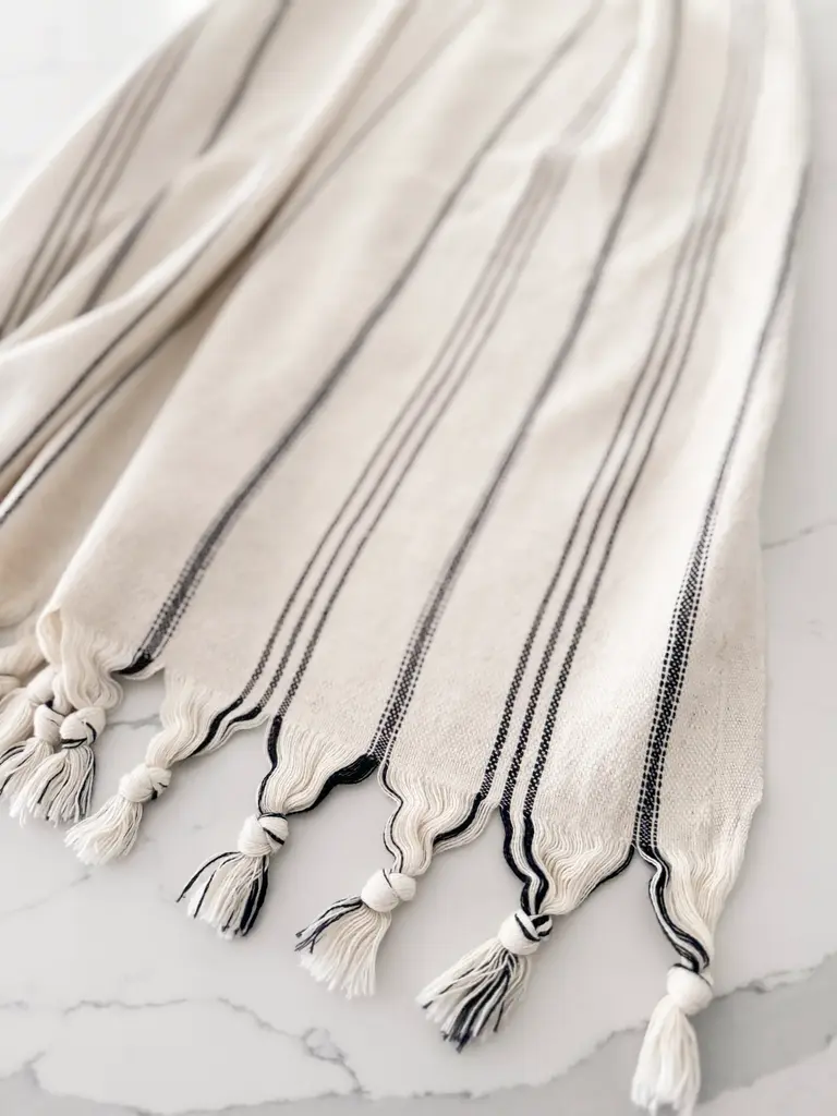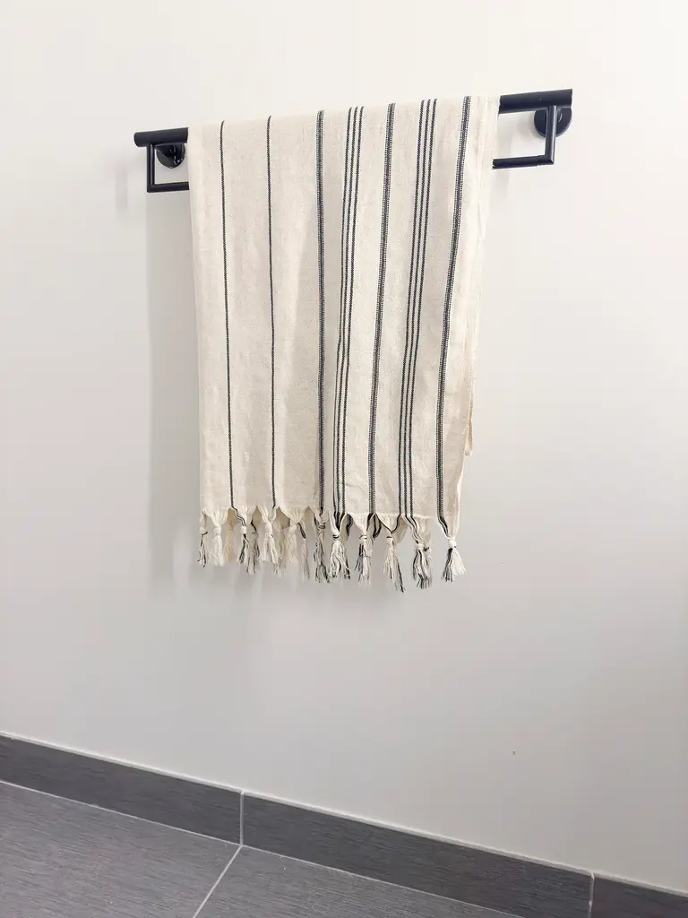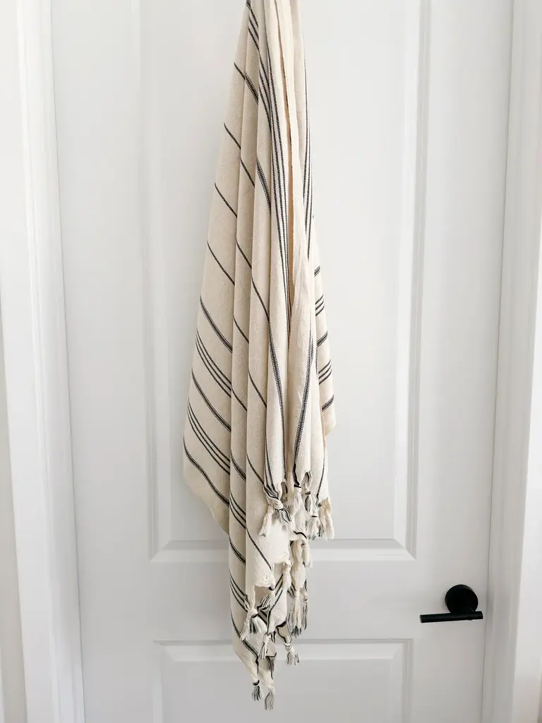 Natural Linen Black Stripe Bath Towel With Knotted Fringe