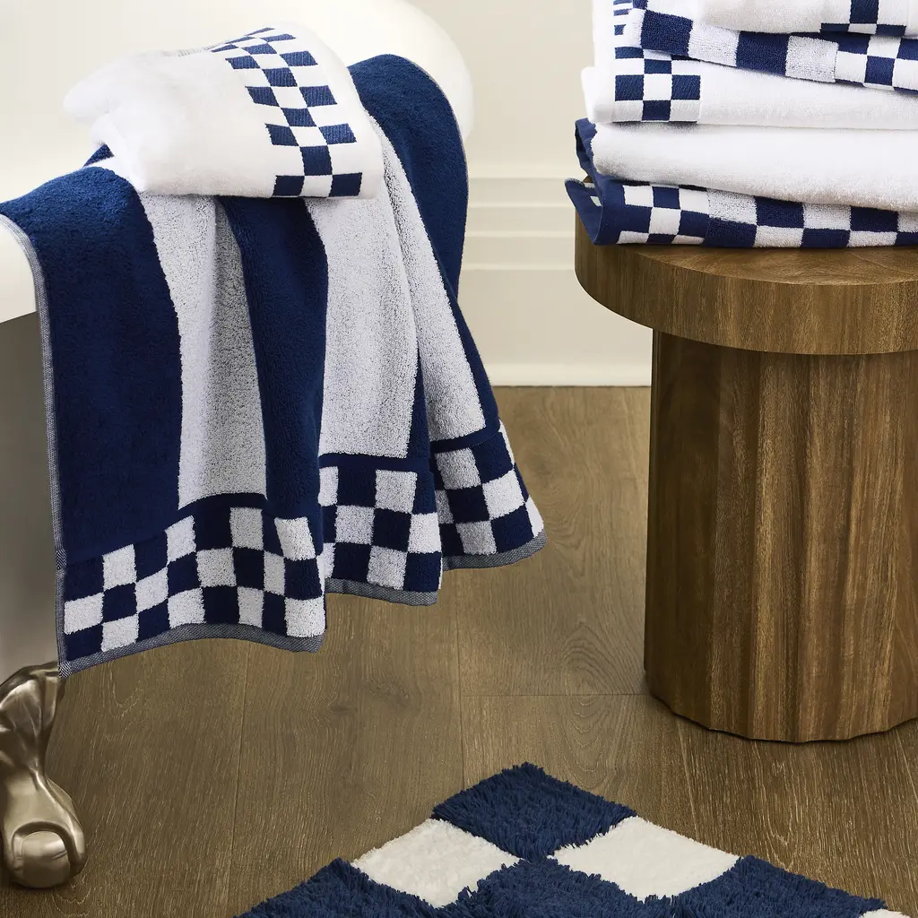 Make a splash with the plush feel and contrasting tones of our 100% cotton terry Navy Stripe Bath Towel. Features a refined navy and white pattern and is trimmed with complementary miniature Navy checks. Give your bath an instant makeover and turn scrubbing up into something spectacular.