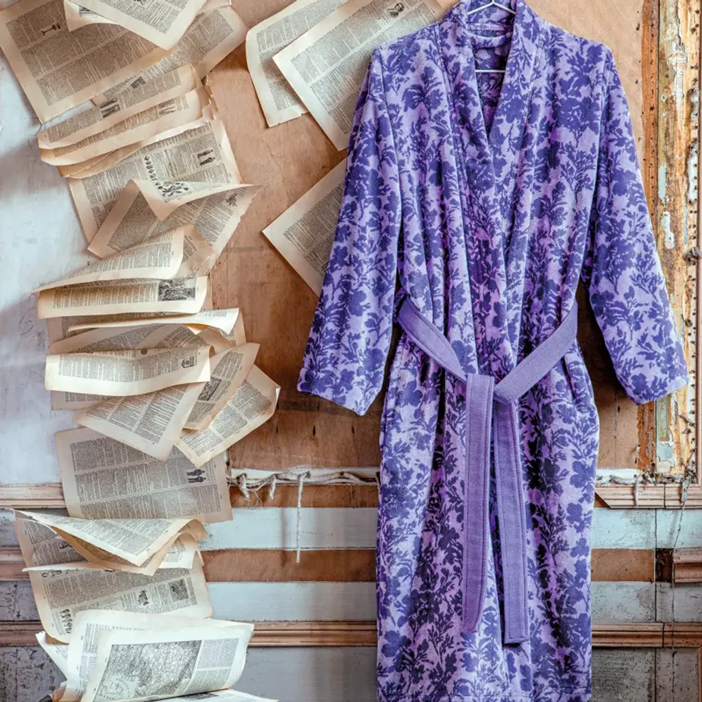 Perle Lune bath towels and bathrobes are luxurious. Perle Lune towels offer luxurious, classic white loop stitch embellished with a very unique embroidered detailing, the motif taken from the Perle Lune bedding design's flowers. Each towel size has a different embroidered floral motif. The embroidery is special, very detailed, and unusual. Perle Lune bathrobes are velvet, with velvet on the outside and loop stitch on the inside. Perle Lune bathrobes have a shawl collar, hidden pockets, sewn-on rings, and an adjustable tie. The Perle Lune bathrobes have an embroidered detailing on one side of the chest. The flower motif was taken from the Perle Lune bedding.