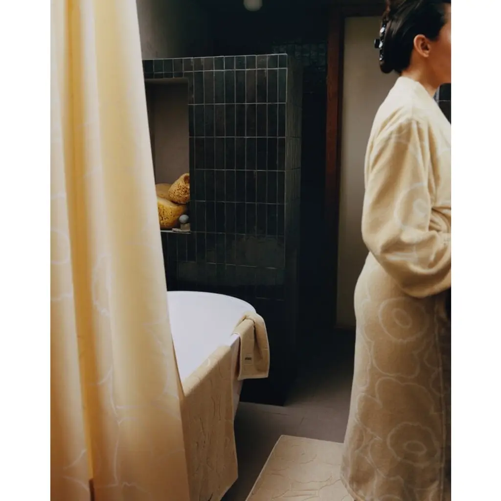 Marimekko's Piirto Unikko bathrobe features Maija Isola's iconic floral pattern in a fun new interpretation: you can only see the outlines of the famous flowers! Made from soft and absorbent organic cotton terry, the Piirto Unikko bath towel adds a bit of elegance to the bathroom décor and everyday routines. Complete the look with Unikko towels or other beloved patterns by Marimekko! The Unikko pattern came about in 1964 after Armi Ratia, the founder of Marimekko, had announced in public that no floral fabrics would be designed at Marimekko. Maija Isola did not accept rules or restrictions and designed in protest a complete collection of bold floral patterns: Unikko, a Finnish word that means poppy. Today, Unikko is one of Marimekko's best-known patterns and is recognized worldwide.