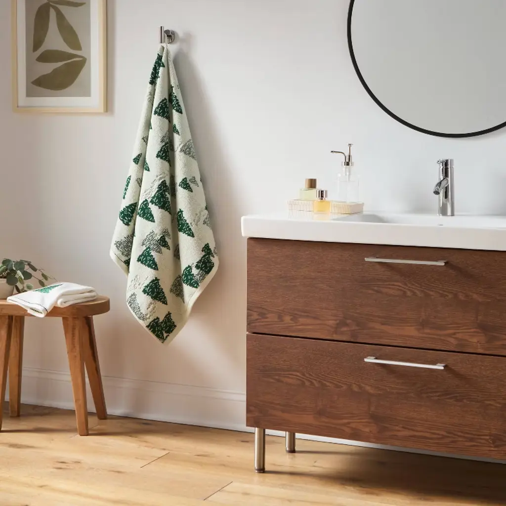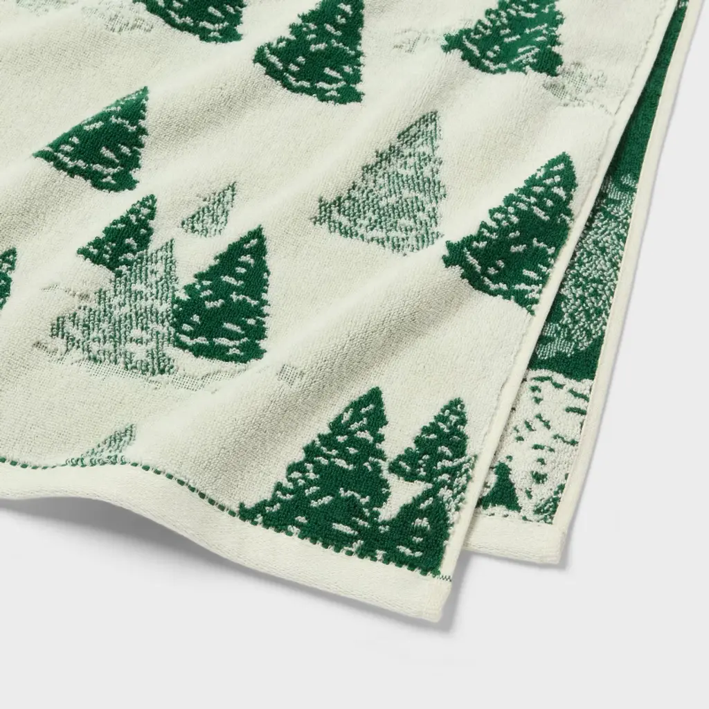 Infuse your bathroom with the spirit of the holiday season with this Christmas Bath Towel from Threshold™. This bathroom towel features allover green Christmas tree print on a cream background, adding a joyful touch to your daily routine. Made of 100% terry cotton, this bathroom towel feels super soft and helps you dry off quickly. Threshold™: Looks like home, feels like you.