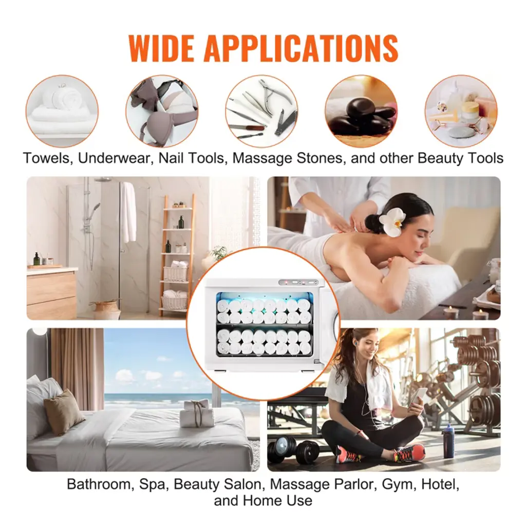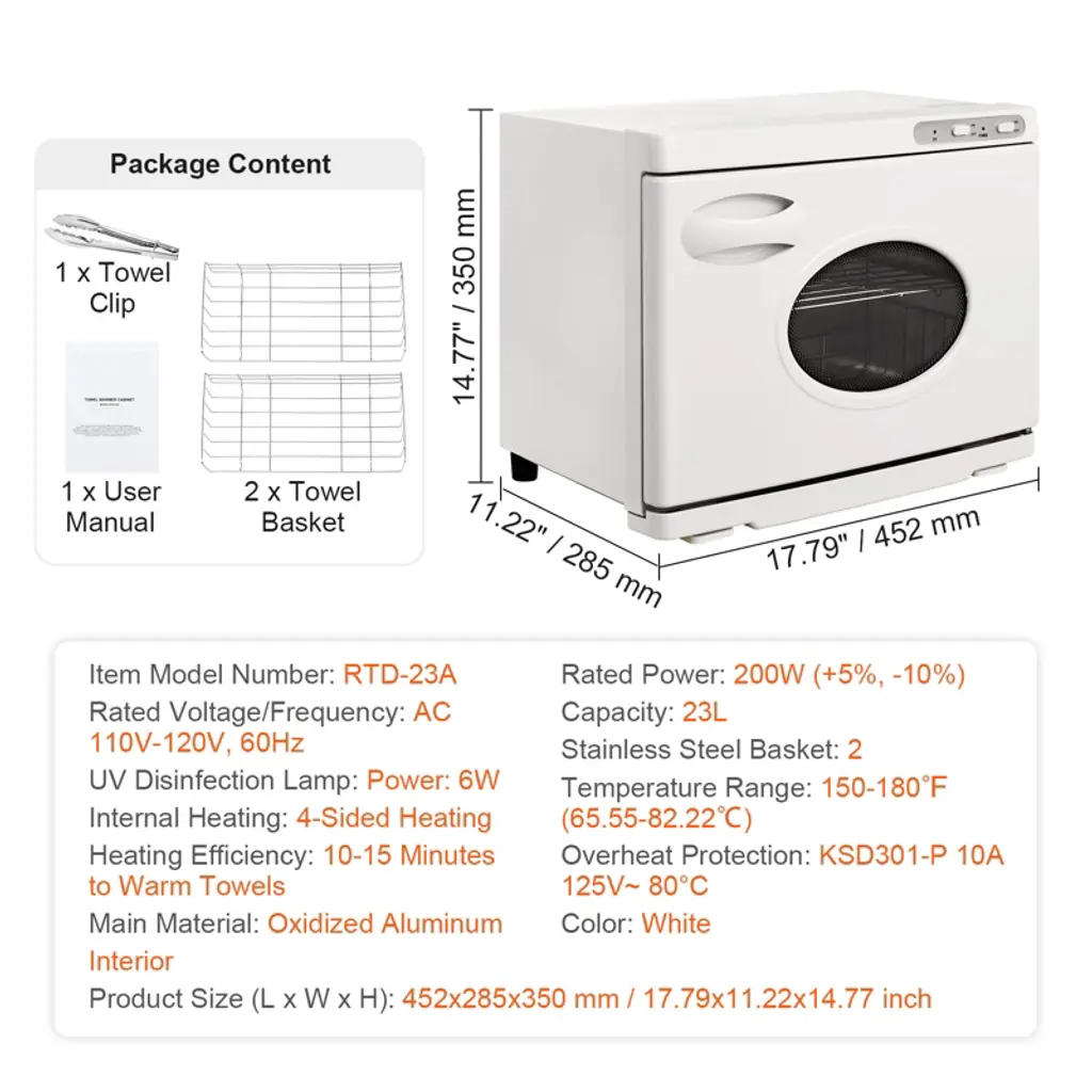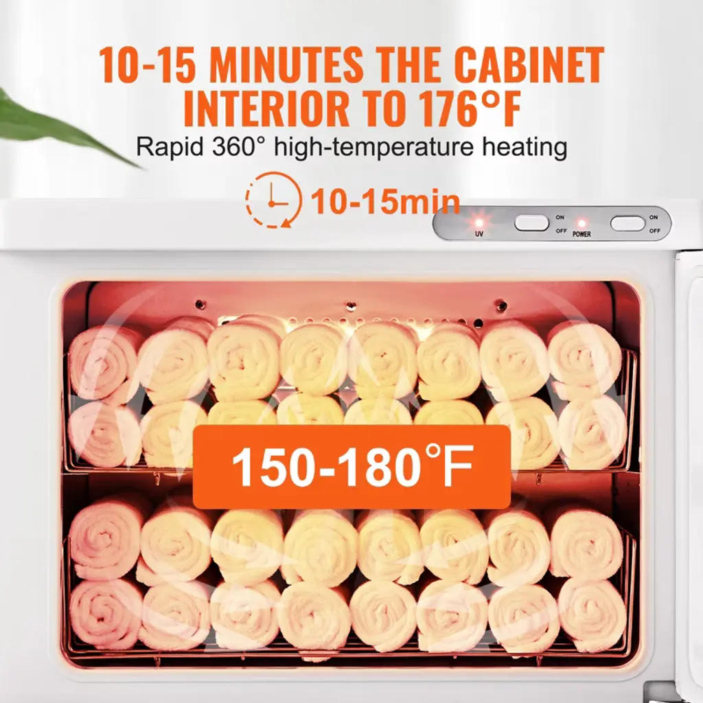 Feature: Spacious Capacity: Boasting an impressive 23L capacity, this hot towel warmer comes with 2 stainless steel racks, an instruction manual, and a clip. It can hold up to 54 standard-sized towels, allowing you to save time by avoiding multiple heating cycles. It's all about efficiency and convenience. Efficient Heating System: Our towel warmer cabinet features a uniform heating function that ensures towels are evenly warmed without any cold spots. In just 10 minutes, your towels can reach a cozy 150-180°F, setting a new industry standard for quick heating. Say goodbye to long waits and get your towels ready in a flash. UV Light for Added Safety: Equipped with powerful 6W UV light, this hot towel cabinet efficiently cleans towels deeply, leaving them softer and more comfortable to use. The towels are cleaner, ensuring safety and peace of mind. Premium Interior Quality: The upgraded aluminum alloy interior improves heat conduction, ensuring that both traditional and disposable towels are heated evenly. Internal temperature control prevents overheating, providing towels with a proper temperature. It's rust-proof and easy to clean. Versatile Applications: This facial towel warmer is suitable for heating face towels, bath towels, undergarments, nail tools, massage stones, and other beauty accessories. It's an ideal addition to homes, spas, bathrooms, beauty salons, hotels, restaurants, and kitchens, offering endless possibilities for your convenience. Package Content 1 x Hot Towel Warmer 1 x Towel Clip 2 x Towel Basket 1 x User Manual