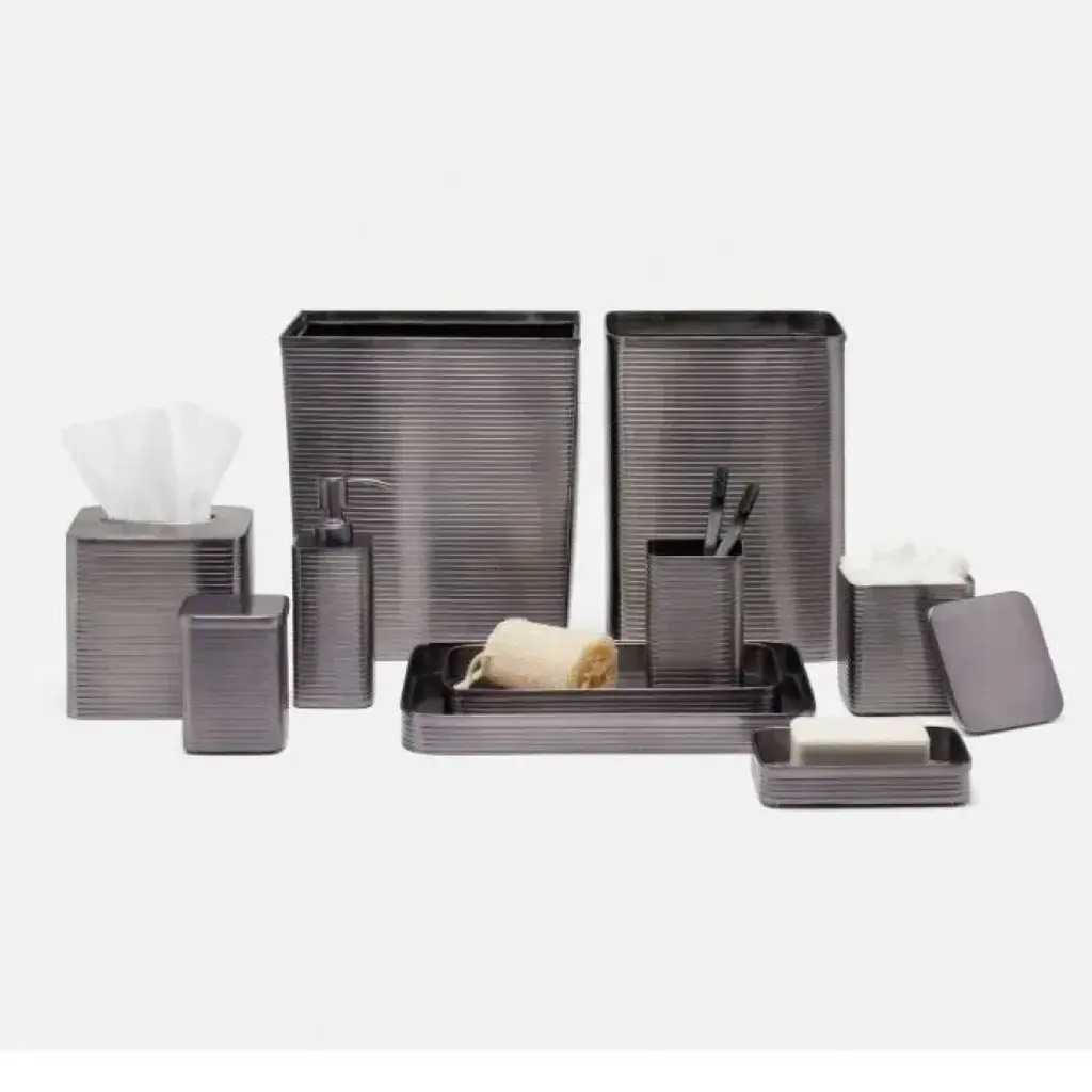 This bath collection's textured stripes—crafted from matte metallics over brass—give the bathroom a clean, polished look. Rounded corners enhance the shine of each piece. The designers at Pigeon & Poodle believe the details of a home are just as important as the furniture. A gorgeous toothbrush holder or handcrafted canister can elevate an entire bath, the perfect frame can heighten the feel of a whole space, and a good-looking storage basket can be your look’s missing link. With thoughtful design and top-notch craftsmanship, Pigeon & Poodle create home accessories with the care and attention typically reserved for larger pieces of décor.