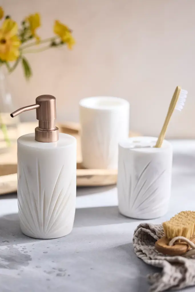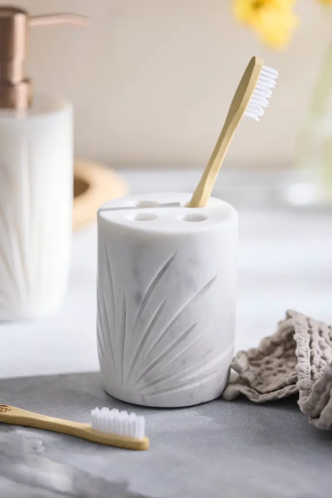 This white marble toothbrush holder is an elegant accent piece for the bath, creating a spa-like atmosphere with its botanical motif.