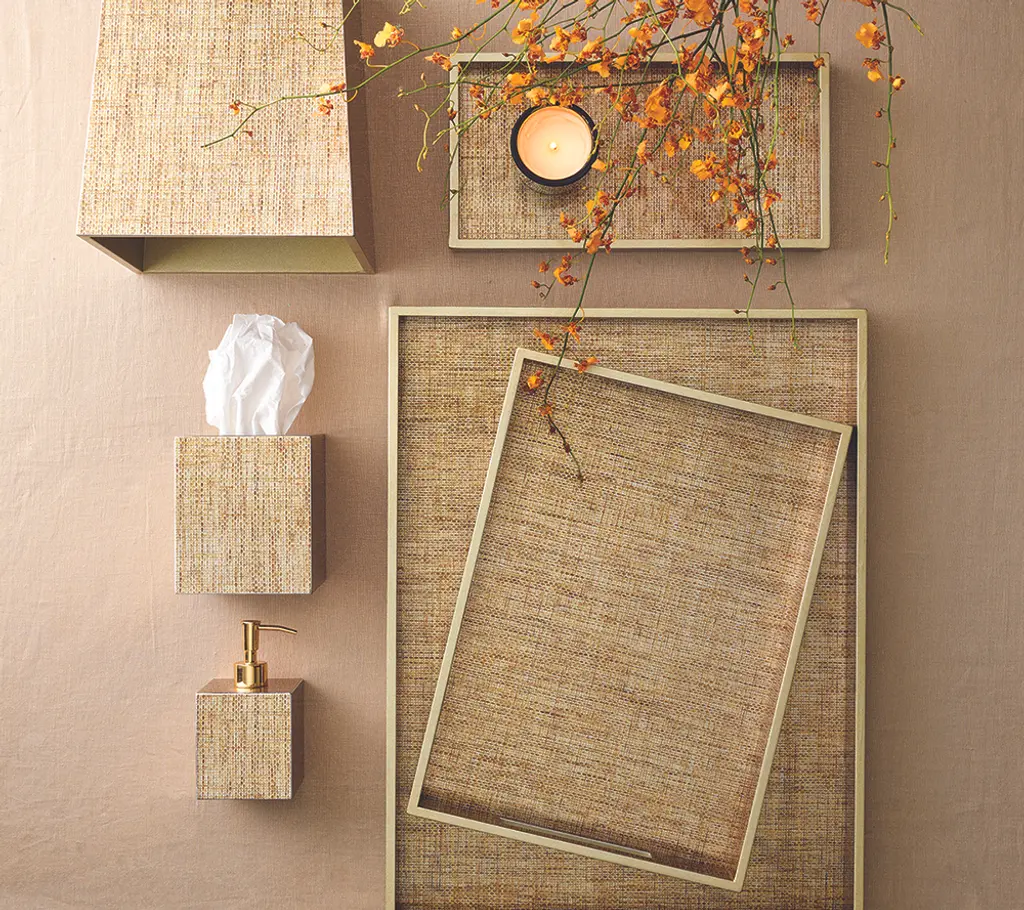 The colors of Cambodia's ancient ruins and temples make their way into our vanity collection. Lacquered raffia with gold accents form these powder room essentials which include a soap dispenser, tissue box, vanity tray and waste basket. Get the full set for a stylish and cohesive look.