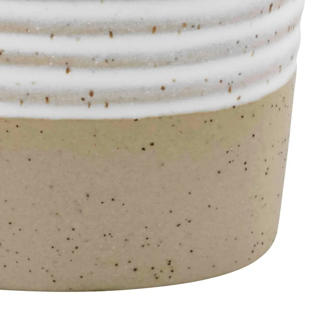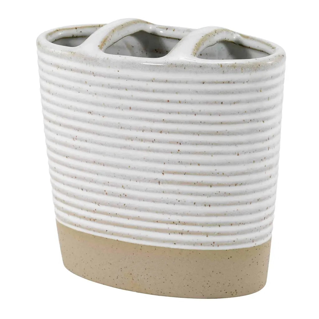 The Avanti Drift Toothbrush Holder features a textured ribbed look with alternating glossy white and linen lines on the body with a solid linen textured matte base. Made out of sand clay with white glaze. Full coordinating bath accessory collection is available. Imported.