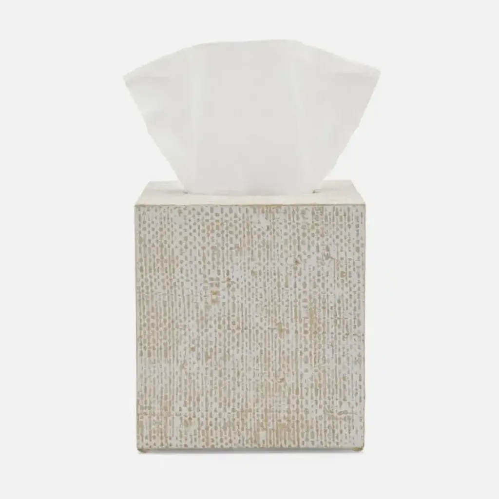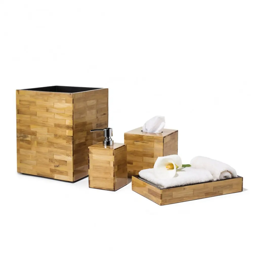 - Handcrafted tissue box made of wood and bamboo veneer from Colombia. - Bamboo tiles are intricately inlaid to create a unique aesthetic, further completed with a high-gloss lacquer finish."