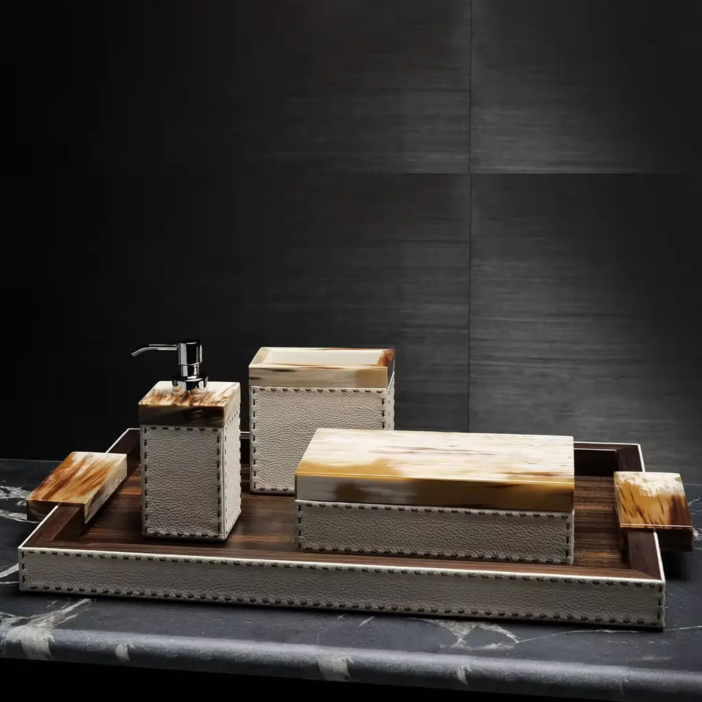 This marvelous soap dispenser will effortlessly uplift modern bathroom decors. Featuring a glistening pump head in chromed brass, its parallelepiped-like body sports a combination of precious horn inlays and fine pebbled beige Aida leather, which covers the majority of the sides and is emphasized by hand-sewn brown stitching revealing its sartorial flair.