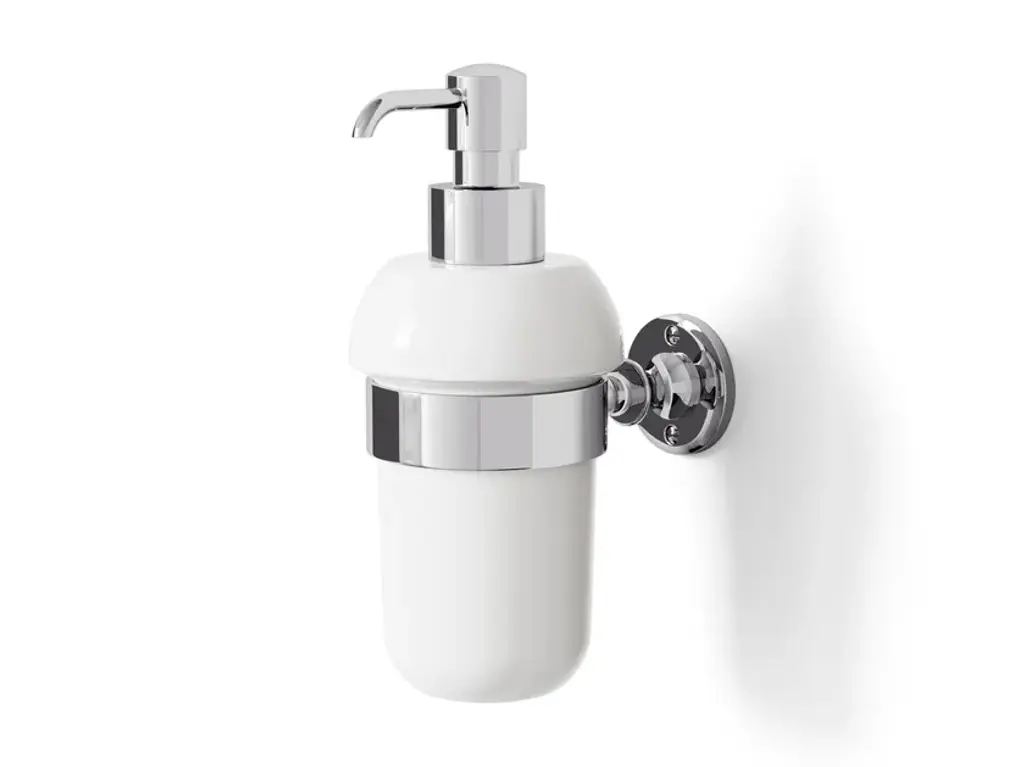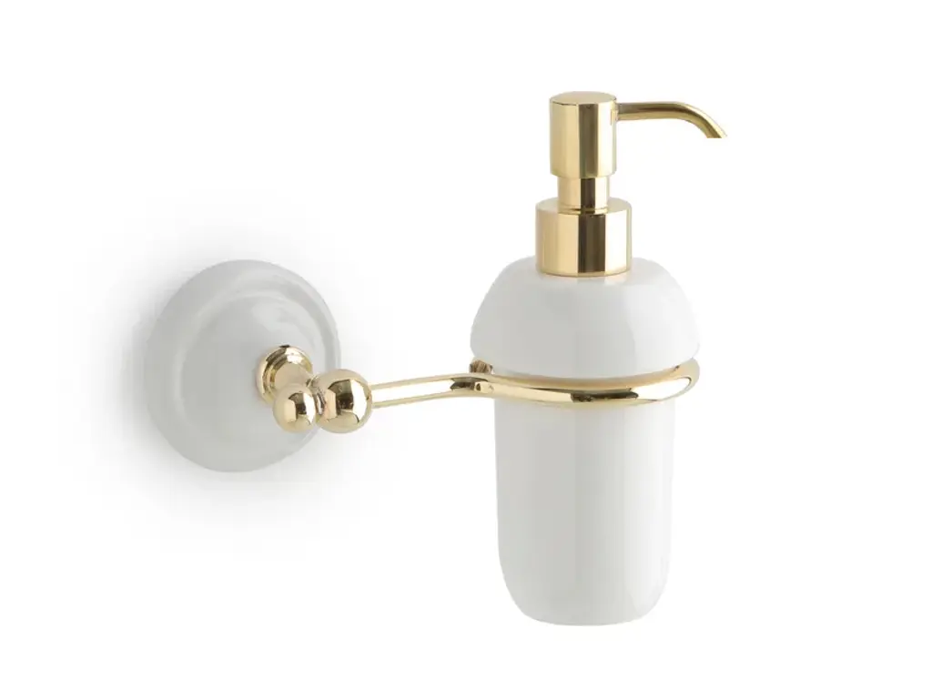 Refined design for Black Diamond, an elegant brass and fine black ceramic wall-mounted soap dispenser with metal pump.