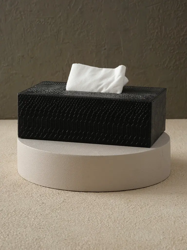 Elevate your daily essentials with the Black Leather Tissue Box, crafted in a sophisticated croc-embossed finish. This rectangular piece makes a bold yet timeless statement, blending texture, elegance, and function. Ideal for bathrooms, living rooms, or office spaces, it transforms a simple tissue box into a luxury accent. The structured silhouette and deep black hue lend it a commanding presence, while the refined detailing keeps it seamlessly modern.