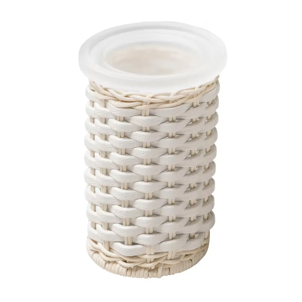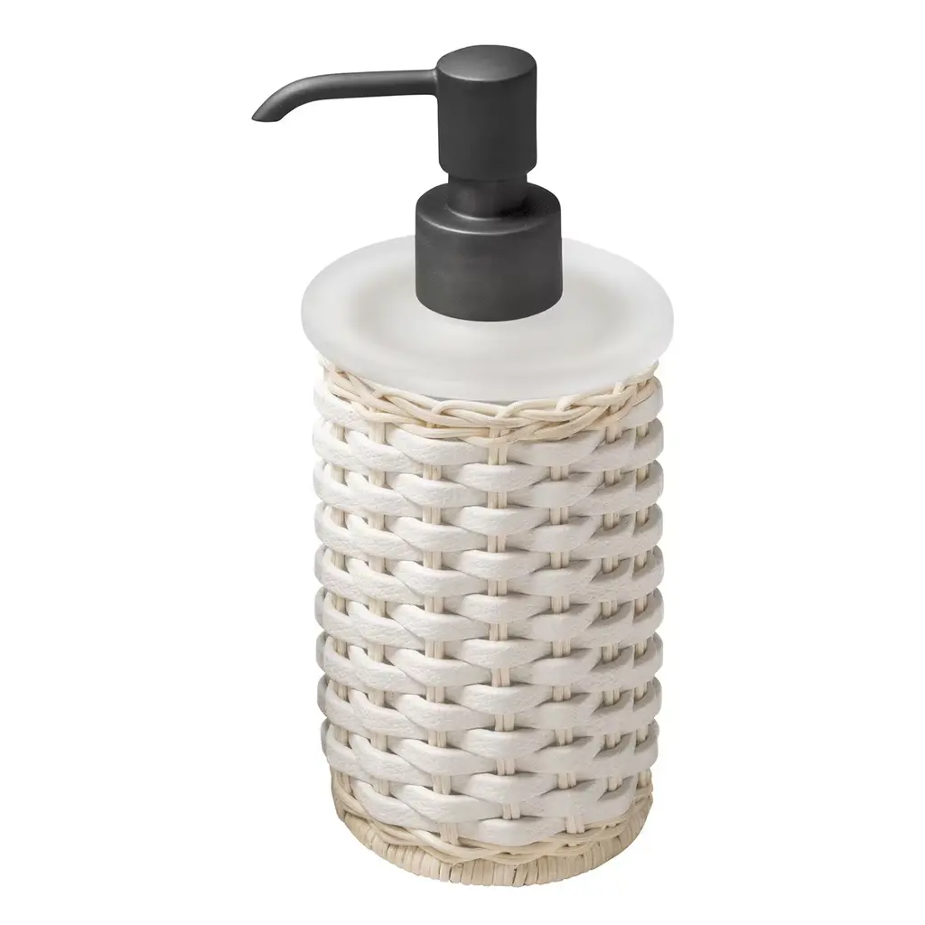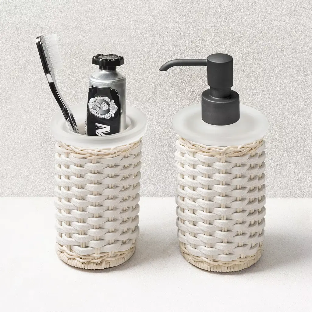 Calais White Leather & Rattan Soap Dispenser And Toothbrush Holder