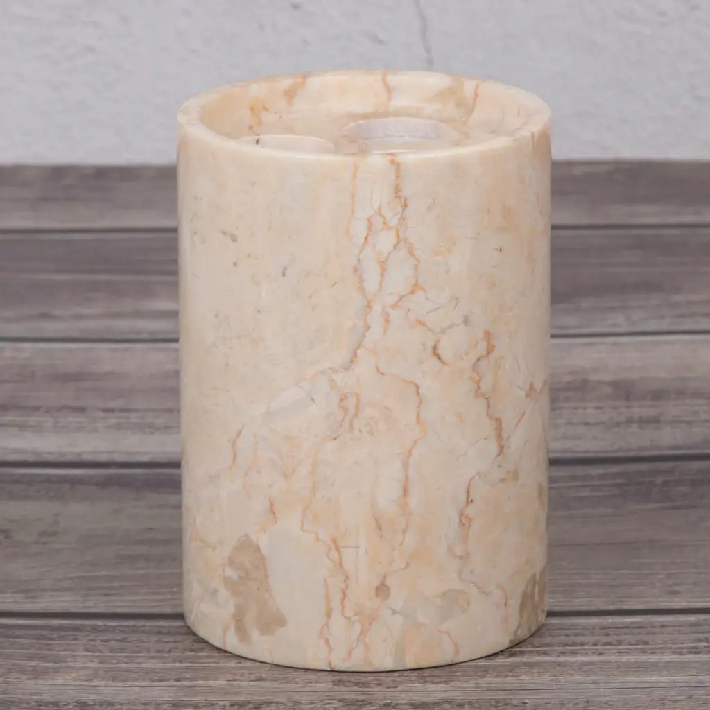 PURE NATURE MATERIAL: Handcrafted with high-grade quality natural marble. Actual product may look slightly different compared to the pictures as all natural stones have their own uniqueness. DURABLE AND HEAVY WEIGHTED: Durable, heavy weight natural marble keeps bath accessories sturdy and increases stability. ELEGANT DESIGN: Elegant and timeless; classic for any décor. EASY TO MAINTAIN: Easy to use and clean. Hand wash and let it air dry. DIMENSIONS: 3-1/4" Diam. x 4-1/2" H