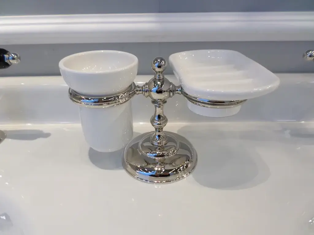 Soap dispenser/toothbrush holder ceramic.Decor - Wide range of freestanding or wall-mounted accessories (soap and toothbrush holders, toilet paper and toilet brush holders, bathrobe hooks, etc...) for bathrooms. Accessories made in ceramic and chrome plated brass, gilded or with many other finishes (nickel, copper, gold, bronze, crystal).