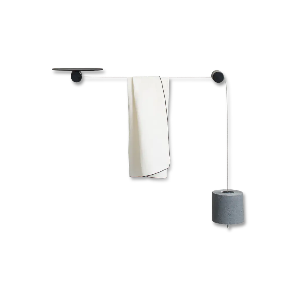 Essential lines with material impact. This collection is identified by its simple, yet at the same time bold, form.It consists of essential pieces such as 30, 45 and 60 cm wide towel rails, double and single hooks, roll holder, liquid soap dispenser, countertop soap dish, towel rail, toilet brush holder, shelf and shelf with towel rail.