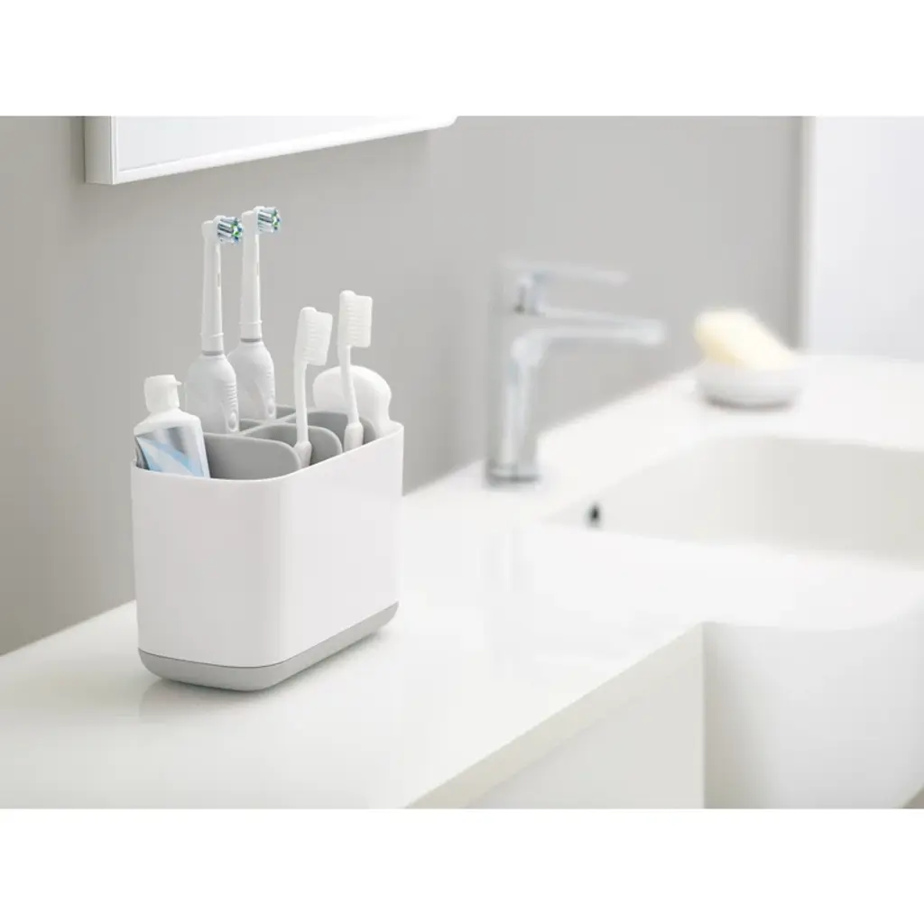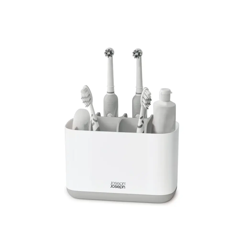 This large toothbrush caddy is divided into several sections providing organized storage for a range of oral care items, including manual/electric toothbrushes, toothpaste tubes, and dental floss. It has a smart stainless-steel finish and features a shallow compartment for small items, a ventilation hole for quick-drying, and a non-slip base. Dismantles for easy cleaning.