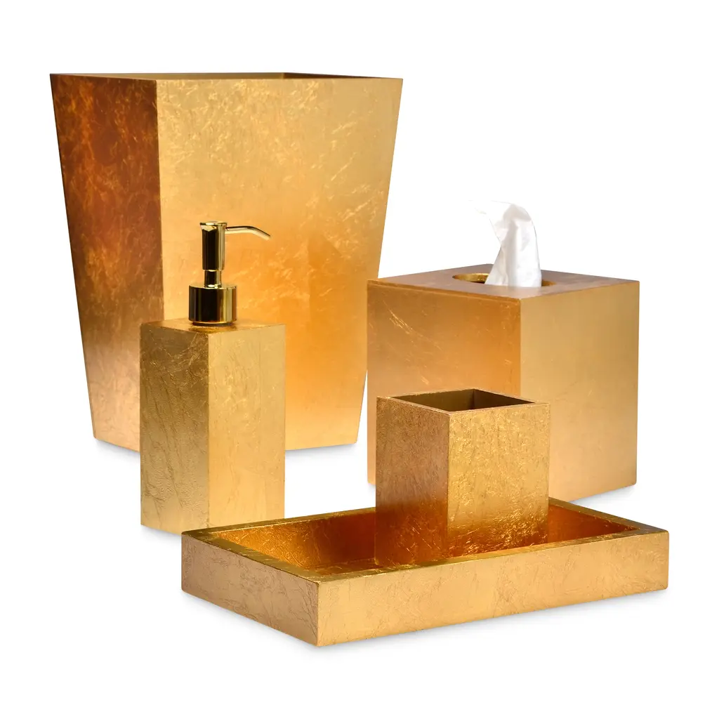 Eternally elegant in silver or gold, this Eos bath collection by Mike and Ally features minimalist wooden structures hand-covered with precious metal leaf.