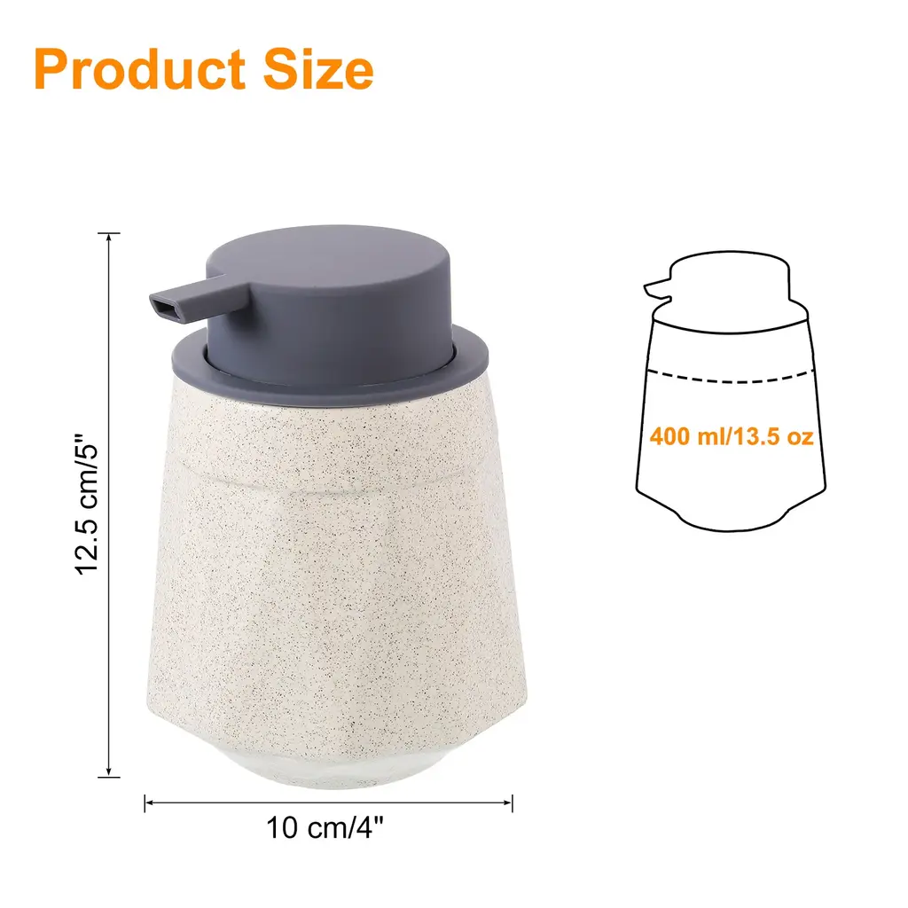 Description:Ceramic Quality and Big Capacity: The soap dispenser is made from quality ABS plastic and ceramic material, which is durable and resistant to wear and tear, and with a capacity of 400 ml/13.5 oz, which is suitable for holding a generous amount of liquid.Create Thick Foam: The foaming soap dispenser features a foaming mechanism that transforms liquid soap into a rich lather, providing a more efficient hand-washing experience.Refillable Design: The soap bottle is refillable and has a wide opening design to help you fill soap effortlessly, allowing users to reuse the dispenser to reduce waste.Simple Operation: Fill the dispenser with liquid soap and 40% water, pump the pump to create foam, and smoothly deliver a proper amount of lather out by a long spout, and wash your hands or body as usual.Versatile Application: The foam hand soap dispenser pump is great for placement in bathrooms, kitchens, laundry, hotels, and more places, for hand soap, dish soap, body wash, shampoo, conditioner, face cleaner, lotion, shaving cream, and so on.Specification:Material: ABS Plastic, CeramicColor: Dark GreyCapacity: 400 ml/13.5 ozDispenser Bottom Diameter: 10 cm/4 inchDispenser Height: 12.5 cm/5 inchPump Head Length: 2.5 cm/1 inchPackage Included: 1 pc x Foaming Soap Dispenser