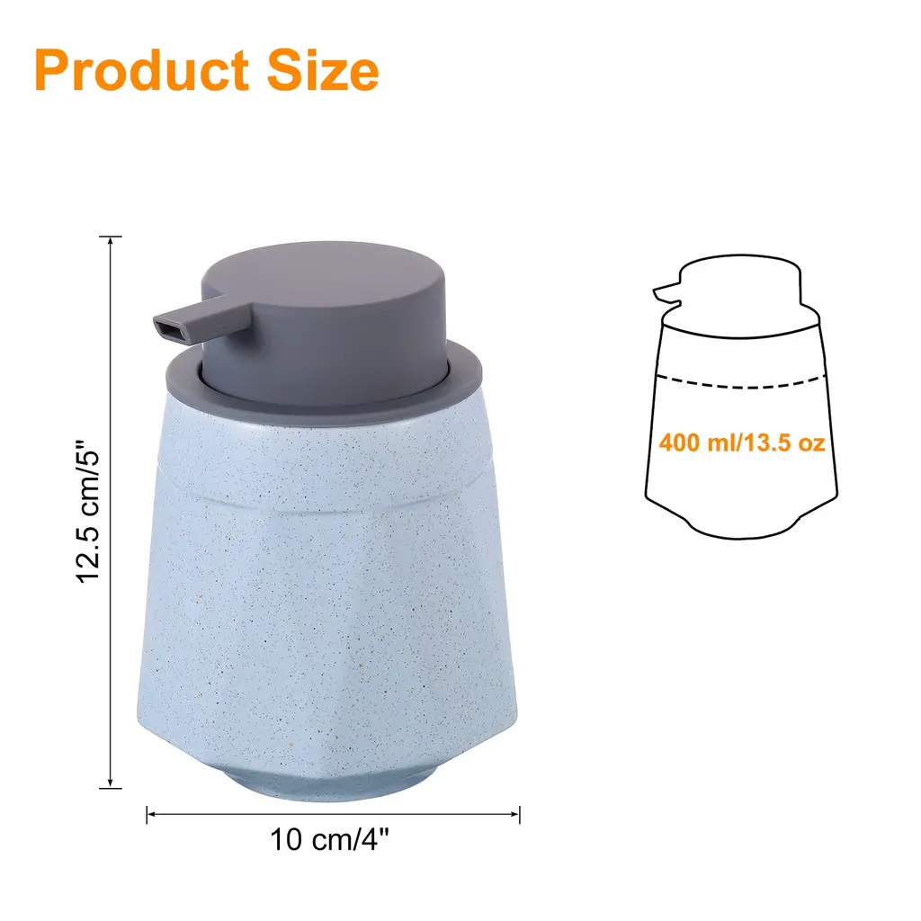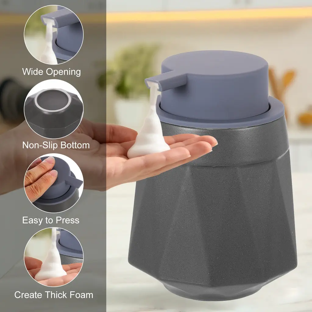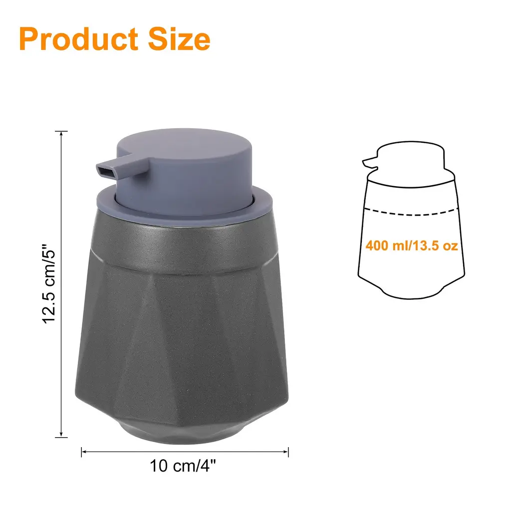 Description:Ceramic Quality and Big Capacity: The soap dispenser is made from quality ABS plastic and ceramic material, which is durable and resistant to wear and tear, and with a capacity of 400 ml/13.5 oz, which is suitable for holding a generous amount of liquid.Create Thick Foam: The foaming soap dispenser features a foaming mechanism that transforms liquid soap into a rich lather, providing a more efficient hand-washing experience.Refillable Design: The soap bottle is refillable and has a wide opening design to help you fill soap effortlessly, allowing users to reuse the dispenser to reduce waste.Simple Operation: Fill the dispenser with liquid soap and 40% water, pump the pump to create foam, and smoothly deliver a proper amount of lather out by a long spout, and wash your hands or body as usual.Versatile Application: The foam hand soap dispenser pump is great for placement in bathrooms, kitchens, laundry, hotels, and more places, for hand soap, dish soap, body wash, shampoo, conditioner, face cleaner, lotion, shaving cream, and so on.Specification:Material: ABS Plastic, CeramicColor: Dark GreyCapacity: 400 ml/13.5 ozDispenser Bottom Diameter: 10 cm/4 inchDispenser Height: 12.5 cm/5 inchPump Head Length: 2.5 cm/1 inchPackage Included: 1 pc x Foaming Soap Dispenser