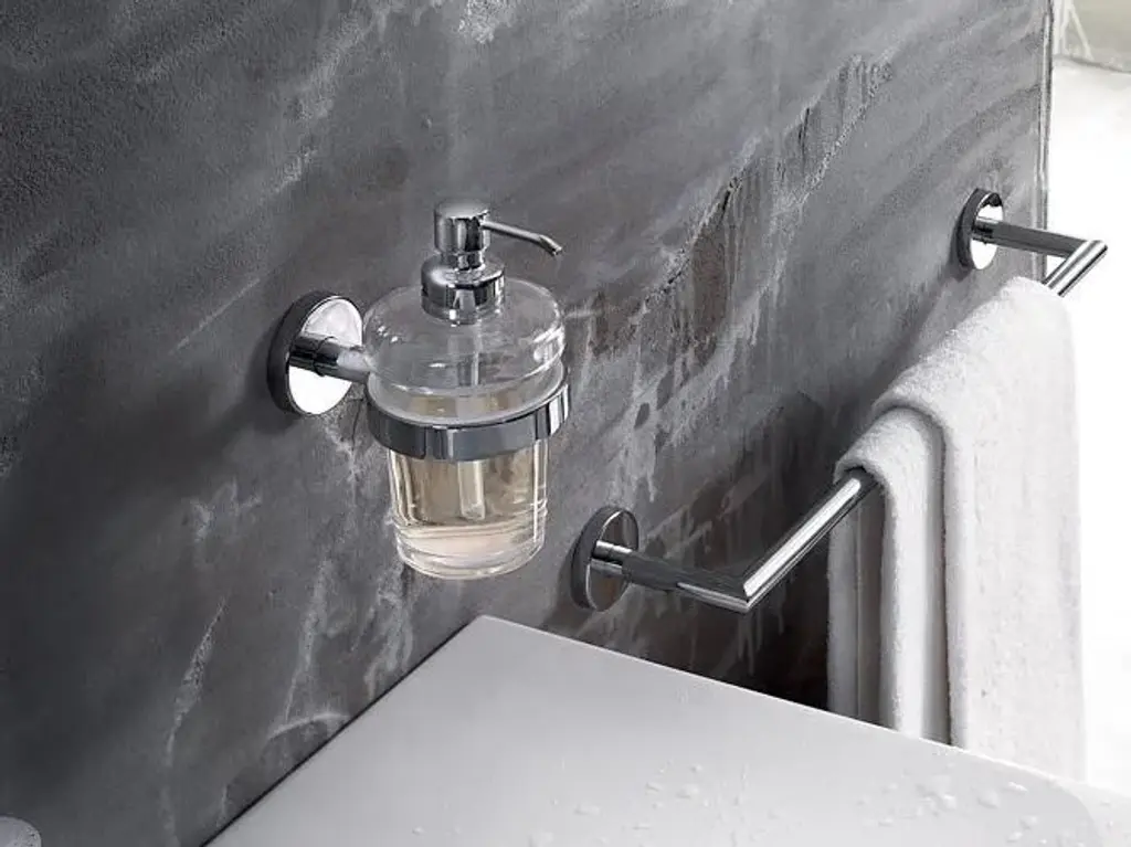 Wall-mounted soap dispenser with extra clear transparent glass container and in finish brass pump.An extremely essential look and of great elegance with the use of absolute top quality materials. Gealuna rigorous design, stands out for its clean, sharp lines. The series can be mounted to the wall using glue does not require to make a hole of ceramics or with screws and dowels.