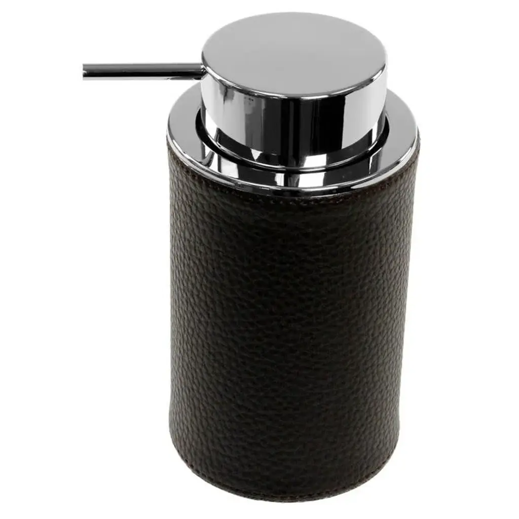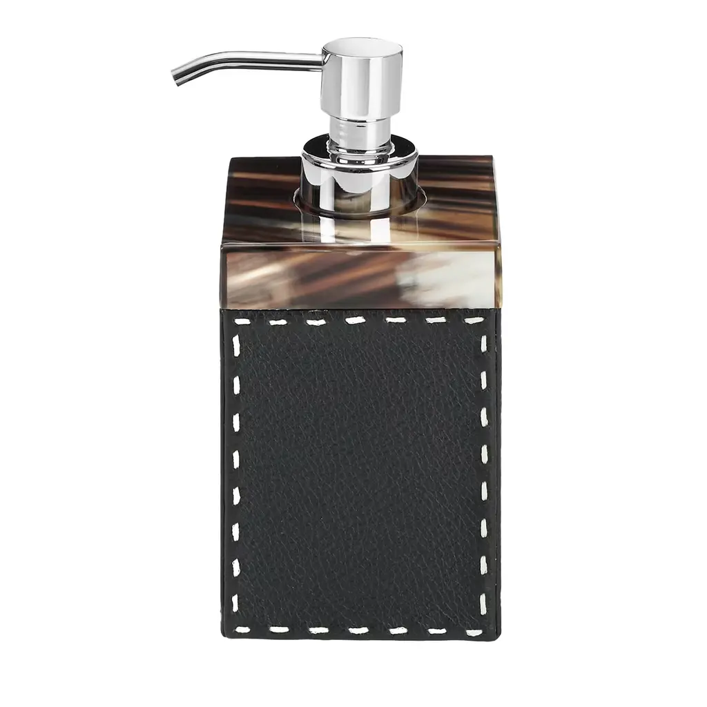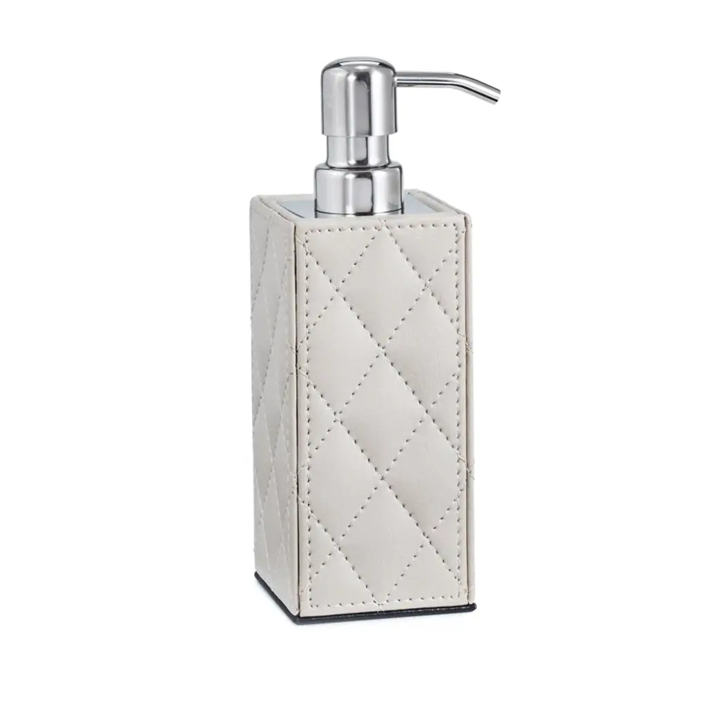 Elegant and clean, this soap dispenser is drawn by sleek and essential lines fashioned of steel and polystone. Enriched with a stunning gray-colored faux leather upholstery showcasing white stitching. Also available in other colors upon choice, please refer to the Concierge for further details and customization options.